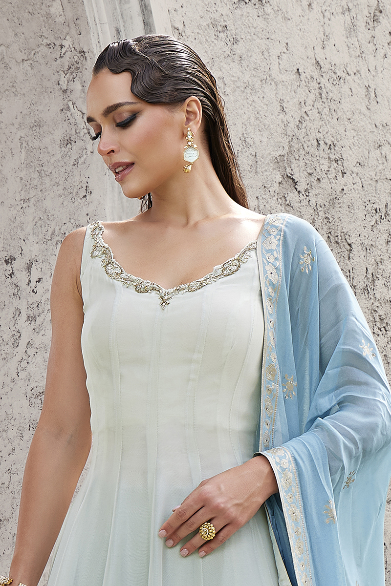 Get praised for your beauty and charm with this Blue colored designer Anarkali suit. Collection of this suit which is made of Dola Silk fabric and is beautifully crafted with Hand Embroidery Work. Pair this suit with ethnic jewellery and a pair of heels to elevate your style. This suit comes with matching palazzo bottom and dupatta. The bottom is made from Dola Silk fabric and dupatta is made from Chinon fabric. Note slight color variation may be possible due to the digital photography. Accessories shown in the image is for photography purpose.