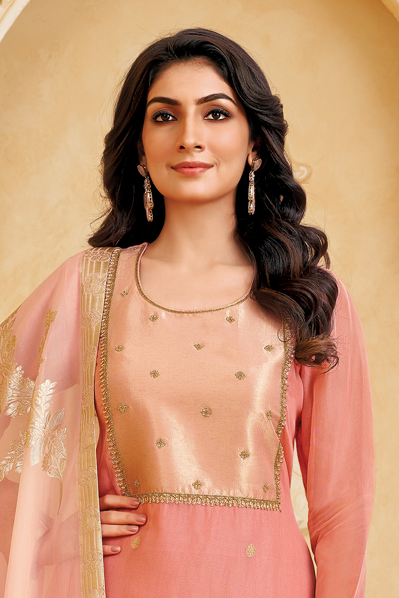 Be the starlight of any event with this beautiful Pink colored designer straight cut suit. Collection of this suit crafted from Chiffon fabric, which features Weaving Print and Embroidery Work. Enhance your ensemble with ethnic jewelry and a pair of heels for a sophisticated touch. The suit comes with a matching dupatta and a bottom made from Chiffon fabric. Please be aware that slight color variations may occur due to digital photography, and the accessories shown are only for illustration.