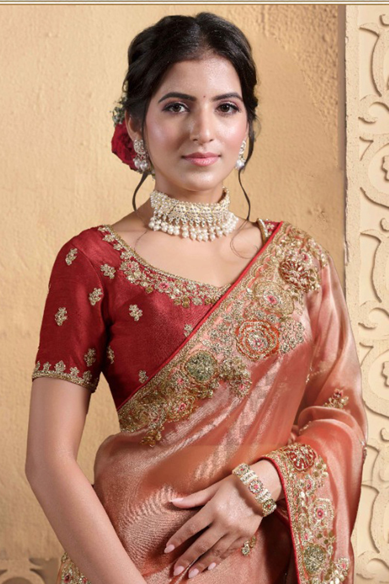 Style and trend will be at the peak of your beauty when you wear this exotic Peach colored designer saree. Buy this saree which is made of Pure Twill Tissue fabric and is beautifully crafted with Pure Khatli Work, Sequence Work. Pair this saree with ethnic jewellery and a pair of heels to elevate your style. This saree comes with Red colored, Viscose Silk Satin fabric Blouse. Note slight color variation may be possible due to the digital photography. Accessories shown in the image is for photography purpose.