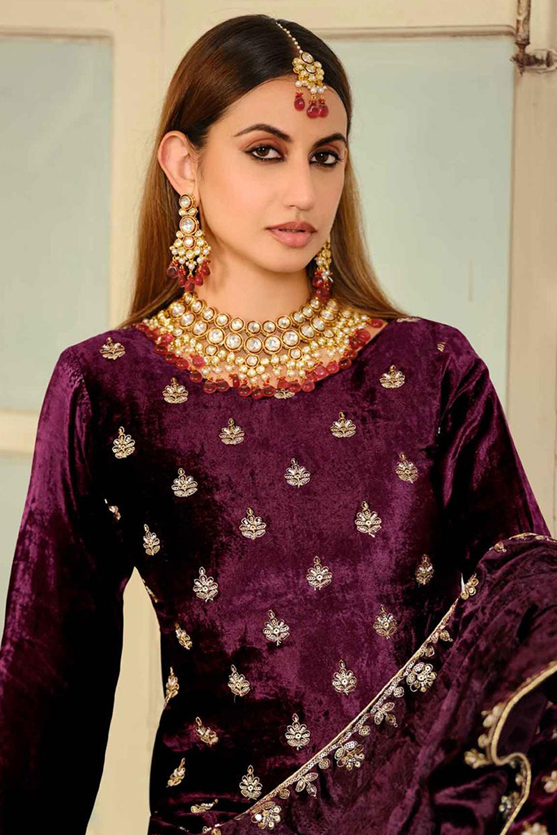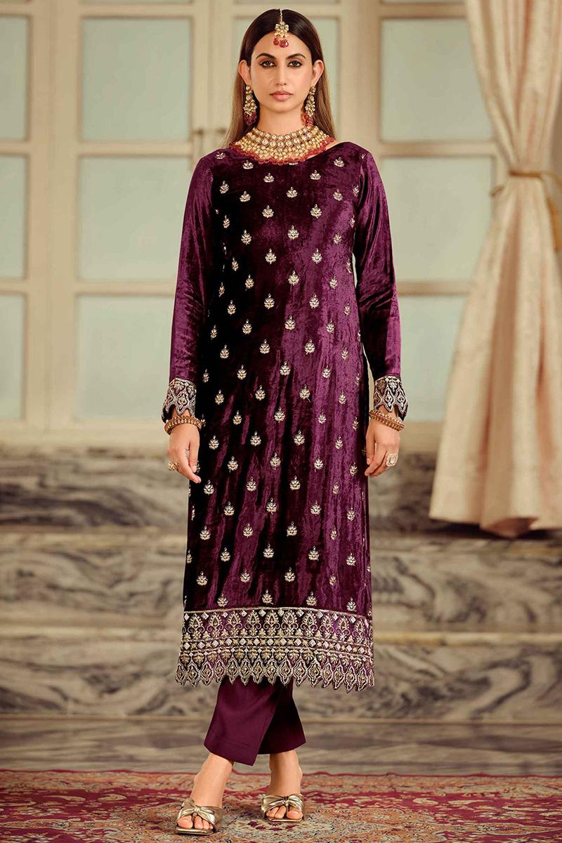 Give in to the divine confluence of today and tomorrow in this beautiful attire. Spread the aura of freshness with this beautiful Burgundy designer Straight cut Suit. Order this suit crafted from Velvet fabric, which features Allover Jardoshi Work With Beads & Sequin. Enhance your ensemble with ethnic jewelry and a pair of heels for a sophisticated touch. The suit comes with a matching dupatta and bottom made from Pashmina fabric. Please be aware that slight color variations may occur due to digital photography, and the accessories shown are only for illustration.