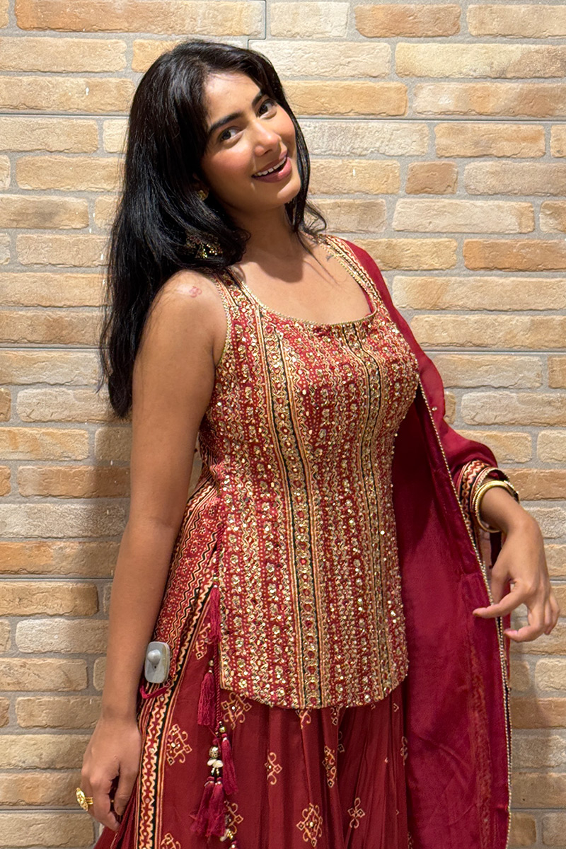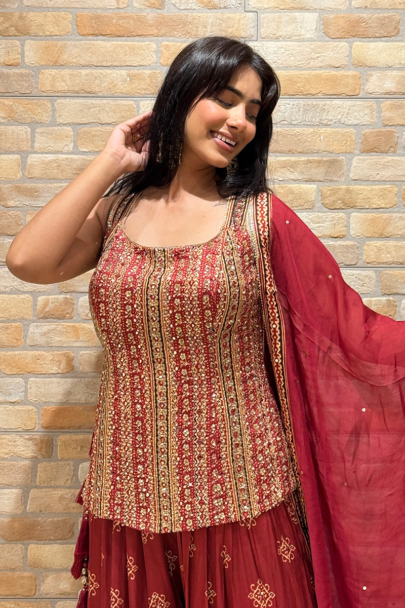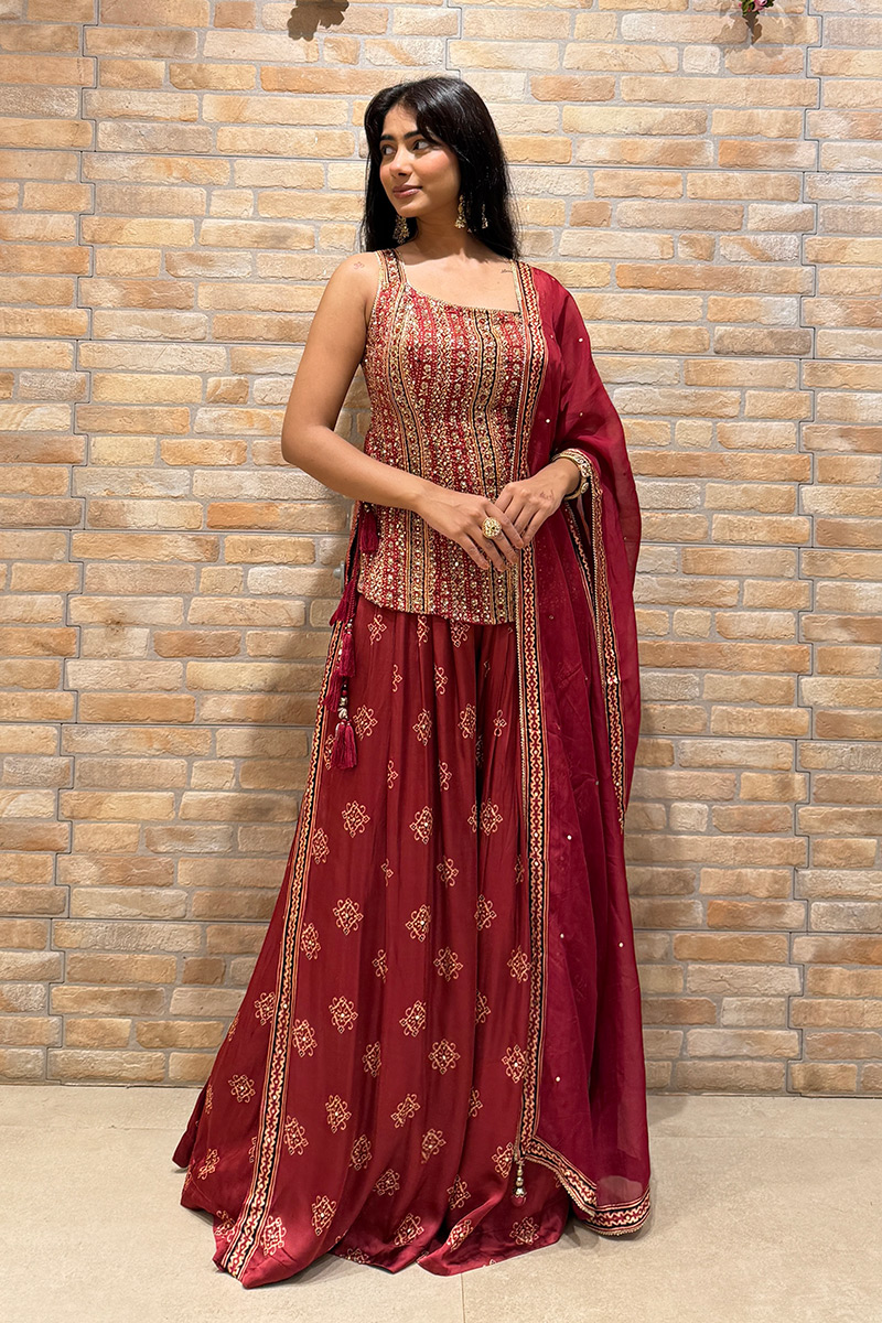 Captivating Maroon Designer Palazzo Suit for Wedding and Reception