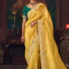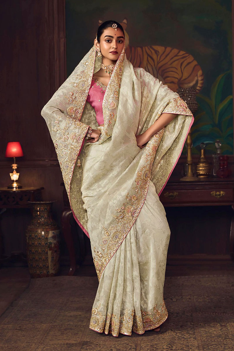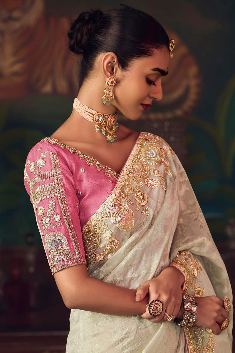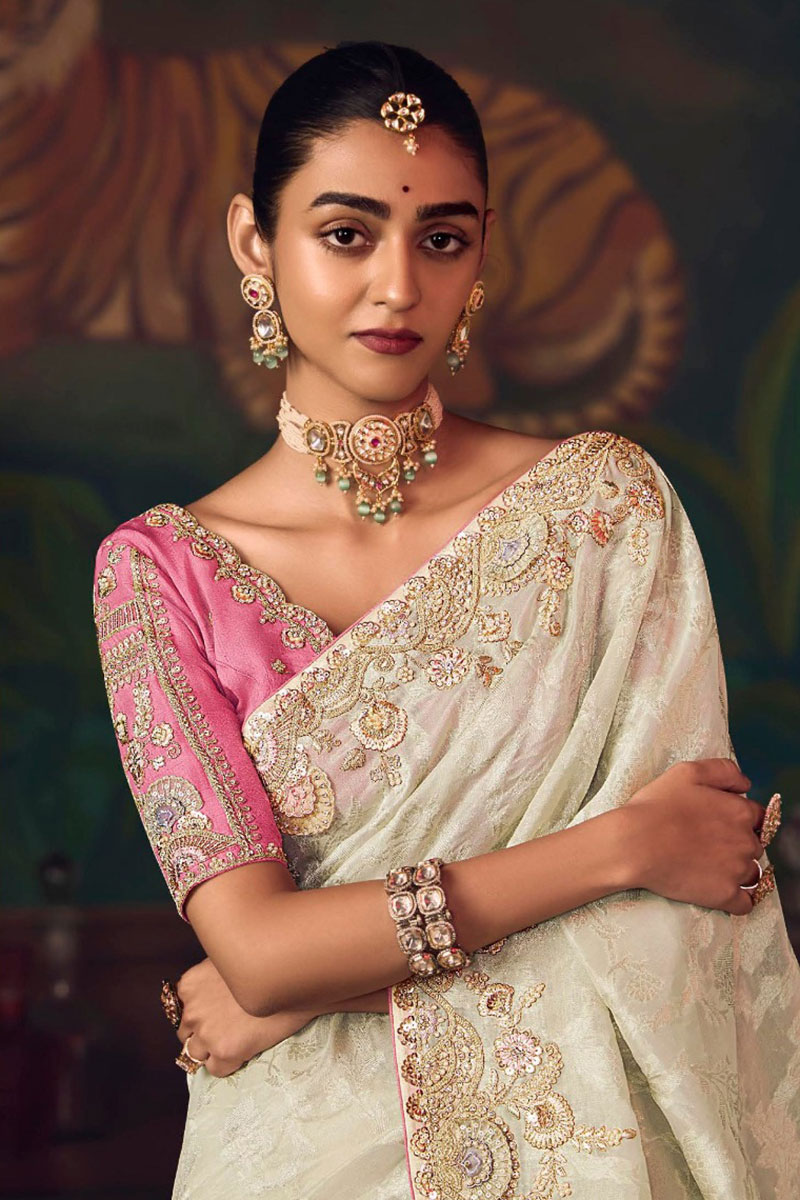 Be the starlight of any event with this beautiful Off White colored designer saree. Buy this saree which is made of Silk fabric and is beautifully crafted with Heavy Embroidery Work. Pair this saree with ethnic jewellery and a pair of heels to elevate your style. This saree comes with Pink Colored, Silk fabric Blouse. Note slight color variation may be possible due to the digital photography. Accessories shown in the image is for photography purpose.