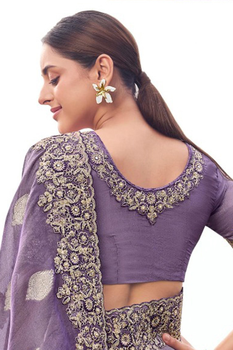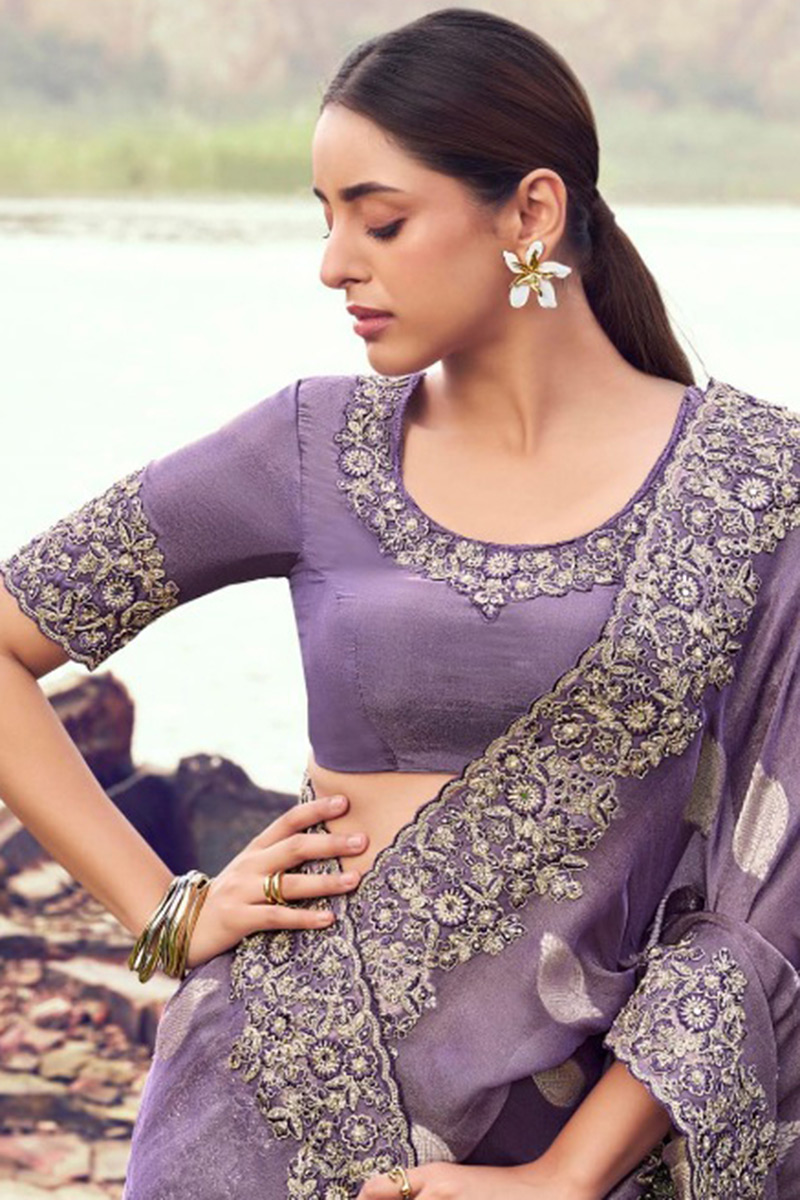 Be the starlight of any event with this beautiful Purple colored designer saree. Buy this saree which is made of Tissue Silk With Jacquard fabric and is beautifully crafted with Embroidery Work. Pair this saree with ethnic jewellery and a pair of heels to elevate your style. This saree comes with Purple coloured, Pure Tissue fabric Blouse. Note slight color variation may be possible due to the digital photography. Accessories shown in the image is for photography purpose.