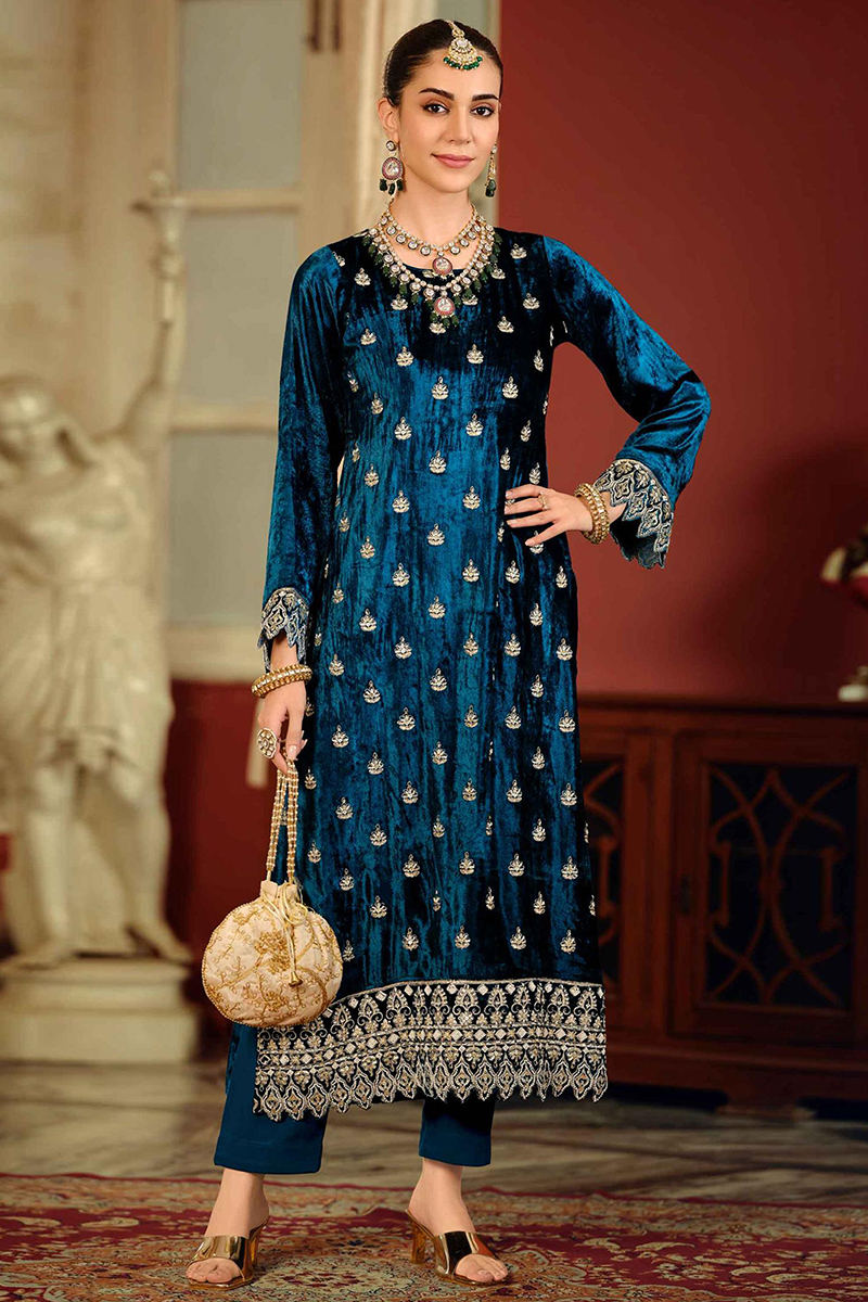 Give in to the divine confluence of today and tomorrow in this beautiful attire. Bewitch anyone at any event with this beautiful Navy Blue designer Straight cut Suit. Collection of this suit crafted from Velvet fabric, which features Allover Jardoshi Work With Beads & Sequin. Enhance your ensemble with ethnic jewelry and a pair of heels for a sophisticated touch. The suit comes with a matching dupatta and bottom made from Pashmina fabric. Please be aware that slight color variations may occur due to digital photography, and the accessories shown are only for illustration.