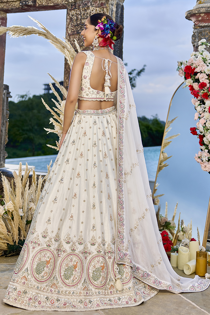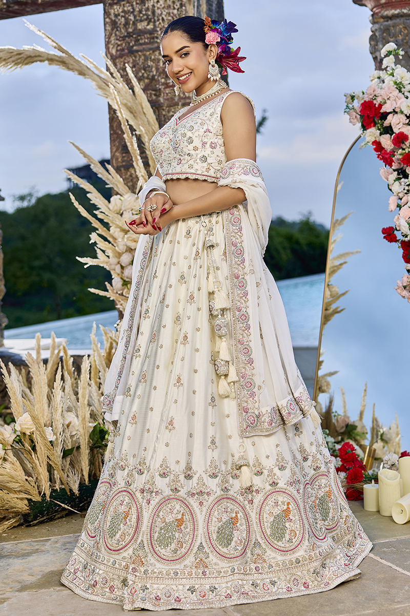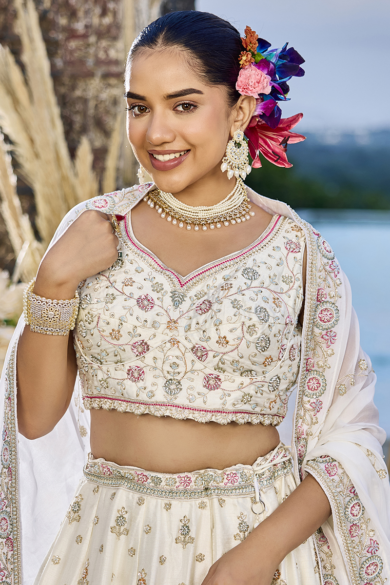 Bewitch anyone at any event with this beautiful Cream colored Designer Indo-Western Lehenga Choli. Shop online for this lehenga choli crafted from Silk fabric embellished with Sequin, Embroidery, and Coding Work. Has a Thread Cut Work Border on the Hemline. The lehenga has a double shantoon inner with 2 layers of can can 12 and 18 inches with 2 layers of Buckram 4 and 12 inches. The latkan adds a charm to the lehenga composed of hand-made round-shaped tassel, with ethnic work hanging beads latkan. The flare of the lehenga is 3.8 meters and the length is 42 inches. The waist and the bust of the lehenga and choli are customizable up to 40 and 42 inches. Complete your look with ethnic jewelry and heels. The ensemble includes a matching, Viscose Organza fabric dupatta embellished with heavy coding with an embroidery border work. The length of the dupatta is 2.5 meters and the width is 1 meter. Please note that color variations may occur due to digital photography, and the accessories shown are for illustrative purposes only.