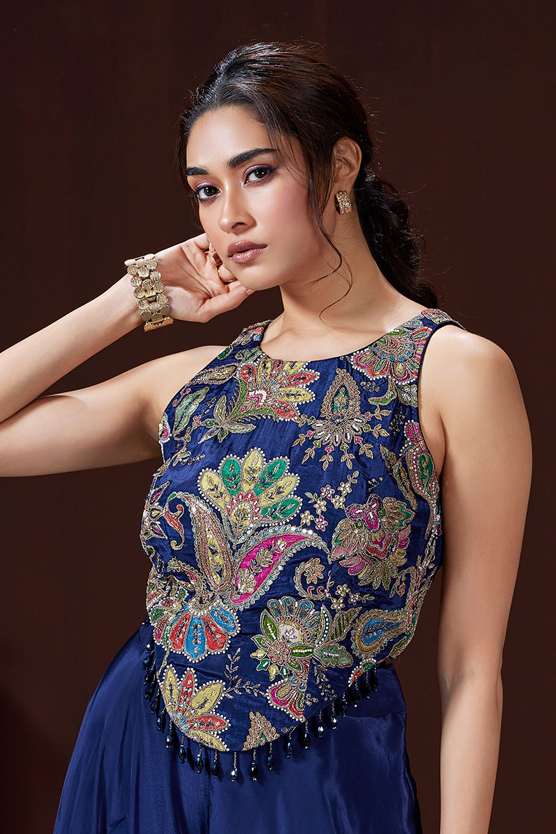 Get praised for your beauty and charm with this exotic Navy Blue colored designer palazzo suit. Order this suit crafted from Silk fabric which features Embroidery Work. Enhance your ensemble with ethnic jewelry and a pair of heels for a sophisticated touch. The suit comes with a matching palazzo bottom made from Silk fabric. Please be aware that slight color variations may occur due to digital photography, and the accessories shown are only for illustration.