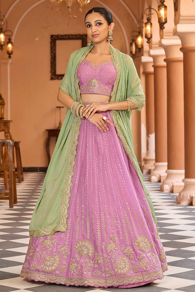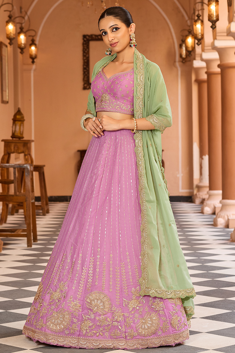 Add more glamour to your style with this beautiful Pink colored Designer Indo-Western Lehenga Choli. Buy this lehenga choli crafted from Tissue Silk fabric embellished with Sequin and Coding Work. Has a Zari Work on the Hemline. The lehenga has a double shantoon inner with layer of can can 18 inches with 2 layers of Buckram 5 and 10 inches. The flare of the lehenga is 3.5 meters and the length is 42 inches. The waist and the bust of the lehenga and choli are customizable up to 40 and 42 inches. Complete your look with ethnic jewelry and heels. The ensemble includes a Lime Green colored, Tissue Silk fabric dupatta embellished with heavy coding with an embroidery border work. The length of the dupatta is 2.5 meters and the width is 1 meter. Please note that color variations may occur due to digital photography, and the accessories shown are for illustrative purposes only.