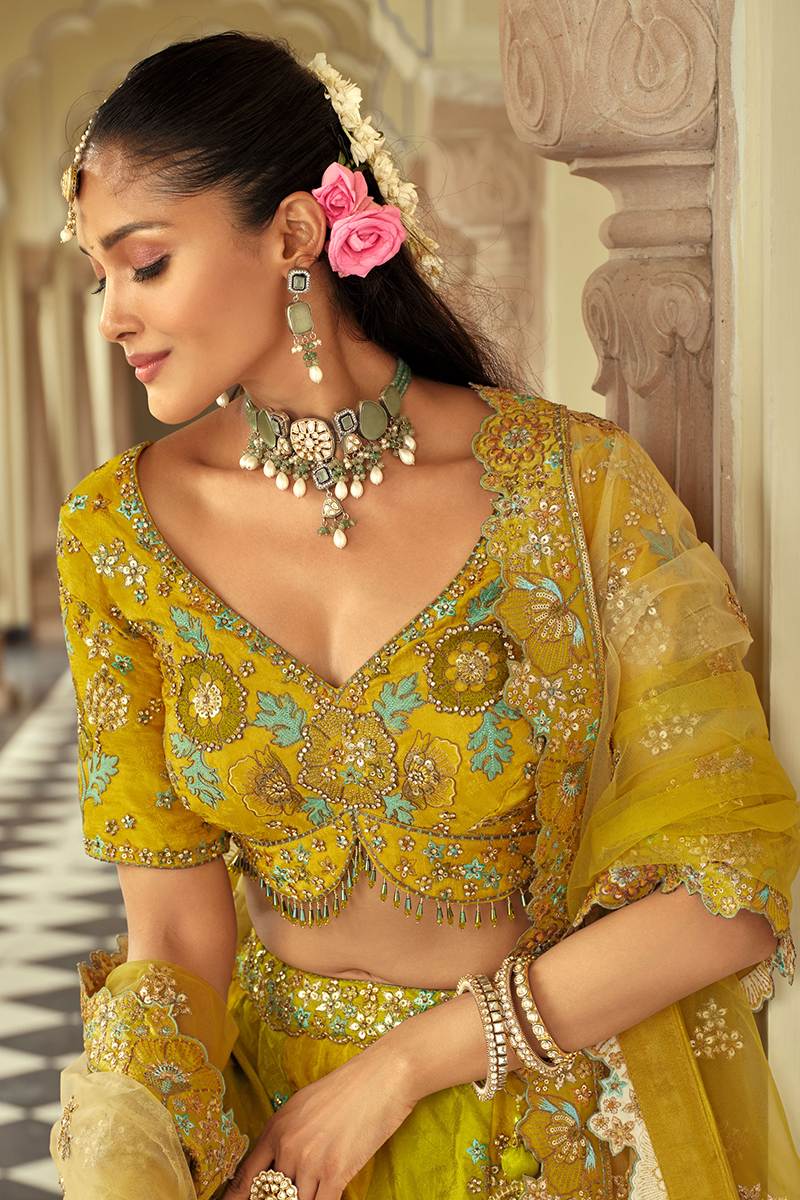 Creative Mustard Green Designer Wedding Lehenga Choli for Mehendi, Wedding, and Reception