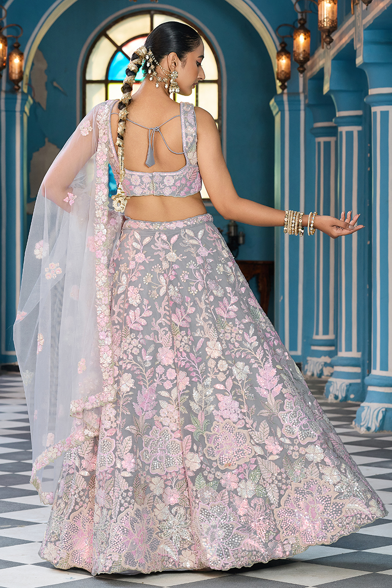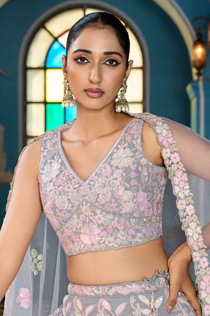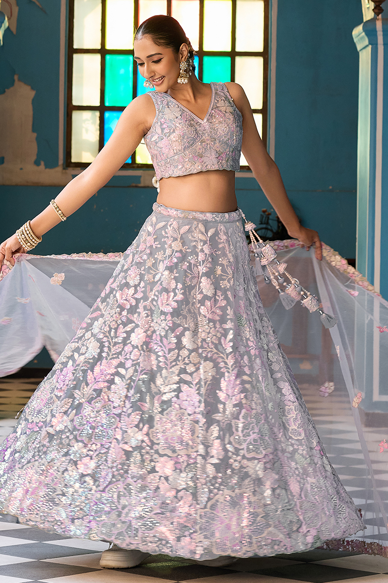 Spread the aura of freshness with this beautiful Grey colored Designer Indo-Western Lehenga Choli. Shop online for this lehenga choli crafted from Net fabric embellished with Sequin, Stone, and Coding Work. Has a Thread Cut Work Border on the Hemline. The lehenga has a double shantoon inner with layer of can can 18 inches with 2 layers of Buckram 5 and 10 inches. The latkan adds a charm to the lehenga composed of hand-made round-shaped tassel, with ethnic work hanging beads latkan. The flare of the lehenga is 3.8 meters and the length is 42 inches. The waist and the bust of the lehenga and choli are customizable up to 40 and 42 inches. Complete your look with ethnic jewelry and heels. The ensemble includes a matching, Net fabric dupatta embellished with heavy coding with an embroidery border work. The length of the dupatta is 2.5 meters and the width is 1 meter. Please note that color variations may occur due to digital photography, and the accessories shown are for illustrative purposes only.