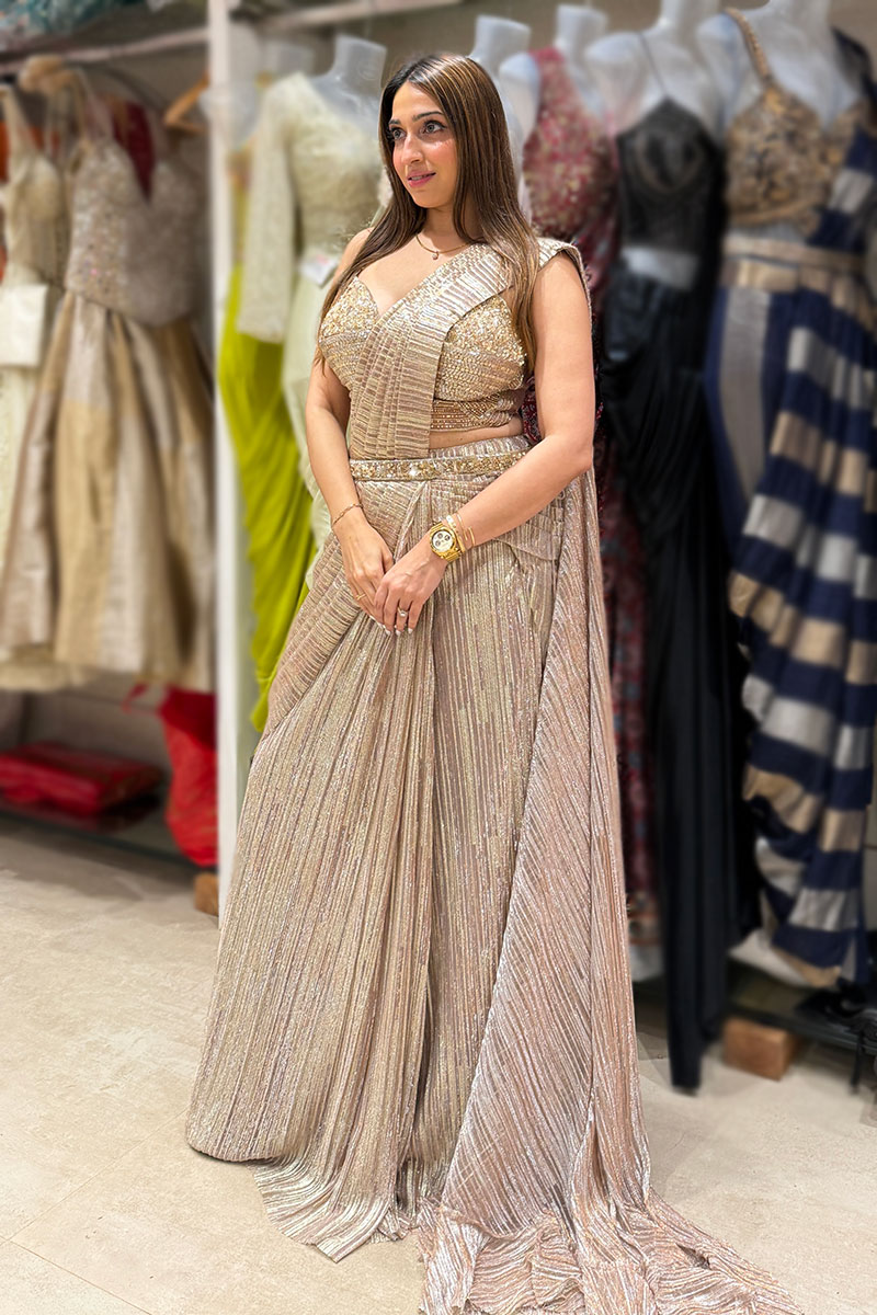 Spread the aura of freshness with this beautiful Beige colored designer saree. Order this saree which is made of Raw Silk fabric and is beautifully crafted with Embroidery Work. Pair this saree with ethnic jewellery and a pair of heels to elevate your style. This Saree comes with matching Blouse and Belt both made from Raw Silk fabric. Note slight color variation may be possible due to the digital photography. Accessories shown in the image is for photography purpose.