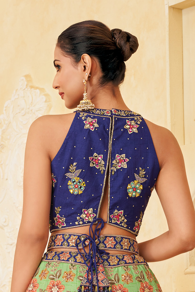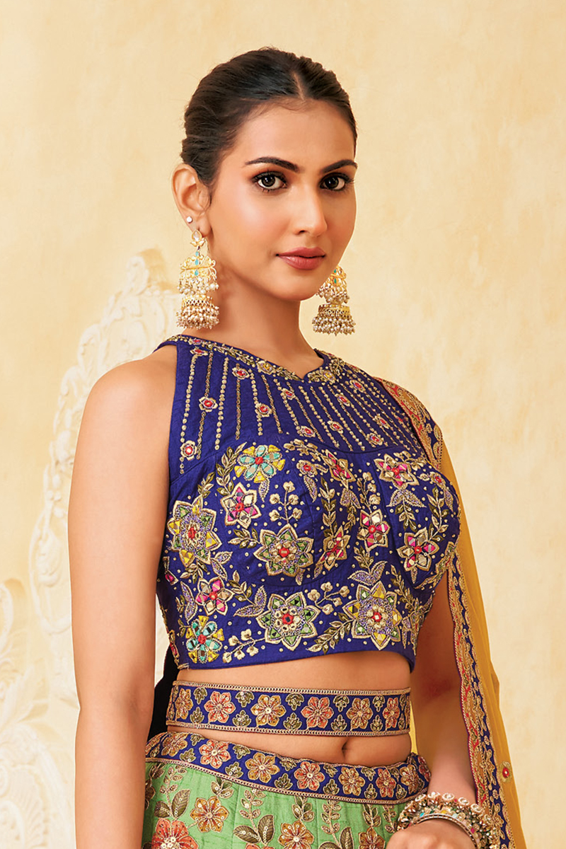 Keep ahead in style and design with this alluring Multi colored designer Indo-Western Lehenga and Navy Blue colored Choli. Collection of this lehenga choli crafted from Silk fabric embellished with Printed, Sequin, Mirror, and Thread Embroidery Work. The waist belt adds a charm to the lehenga composed with ethnic work. Complete your look with ethnic jewelry and heels. The ensemble includes a Yellow colored, Silk fabric dupatta. Please note that color variations may occur due to digital photography, and the accessories shown are for illustrative purposes only.