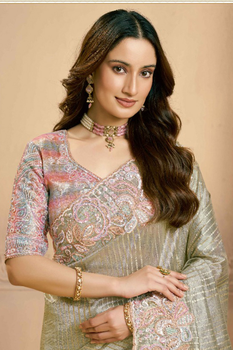 Add more glamour to your style with this beautiful Grey colored designer saree. Order this saree which is made of Handwoven Zari Tissue fabric and is beautifully crafted with Four Sequins Embroidery, Swarovski Work. Pair this saree with ethnic jewellery and a pair of heels to elevate your style. This saree comes with Multi colored, Silk Brocade fabric Blouse. Note slight color variation may be possible due to the digital photography. Accessories shown in the image is for photography purpose.