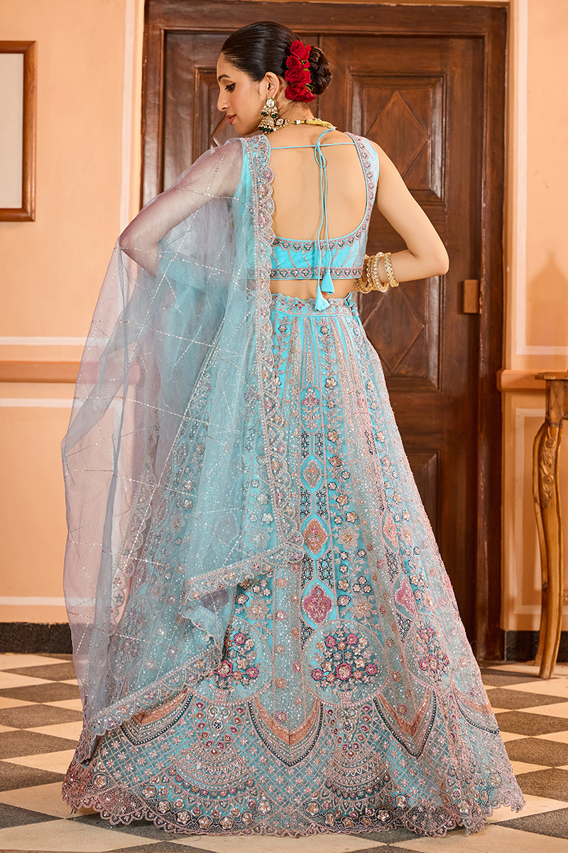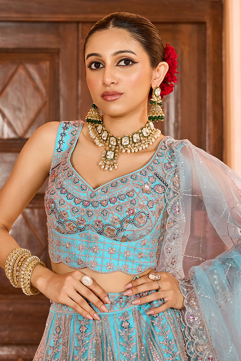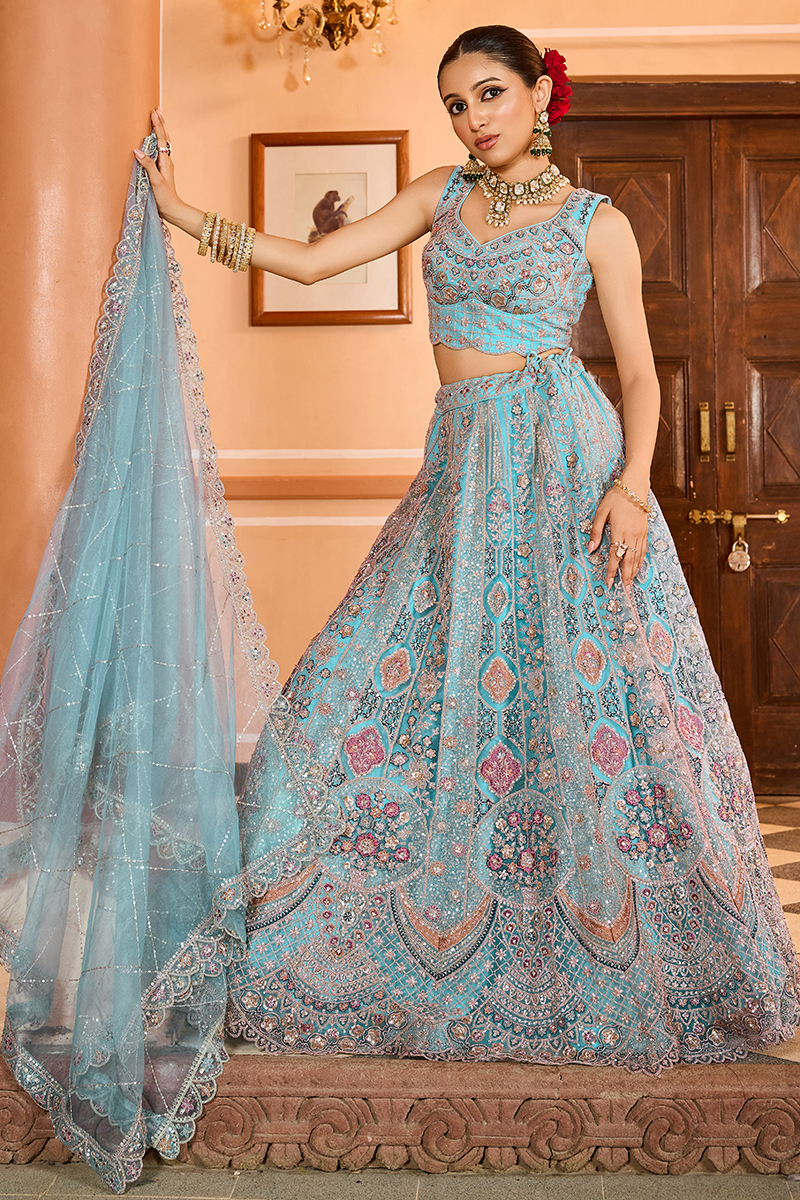 Add more glamour to your style with this beautiful Turquoise Blue colored Designer Indo-Western Lehenga Choli. Shop online for this lehenga choli crafted from Net fabric embellished with Sequin, Stone, and Coding Work. Has a Thread Cut Work Border on the Hemline. The lehenga has a double shantoon inner with layer of can can 18 inches with 2 layers of Buckram 3 and 10 inches. The flare of the lehenga is 3.5 meters and the length is 42 inches. The waist and the bust of the lehenga and choli are customizable up to 40 and 42 inches. Complete your look with ethnic jewelry and heels. The ensemble includes a matching, Net fabric dupatta embellished with heavy coding with an embroidery border work. The length of the dupatta is 2.5 meters and the width is 1 meter. Please note that color variations may occur due to digital photography, and the accessories shown are for illustrative purposes only.