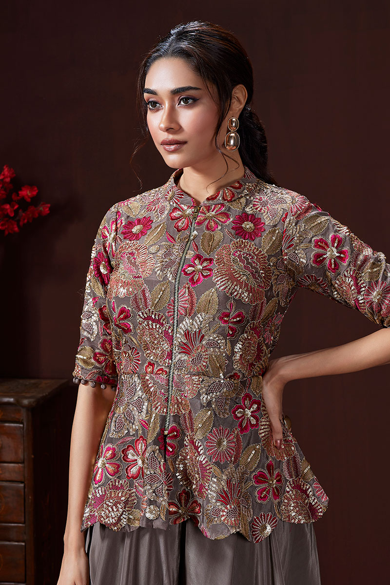 Add more glamour to your style with this beautiful Grey designer palazzo suit. Order this suit crafted from Silk fabric which features Hand Embroidery Work. Enhance your ensemble with ethnic jewelry and a pair of heels for a sophisticated touch. The suit comes with a matching palazzo bottom made from Silk fabric. Please be aware that slight color variations may occur due to digital photography, and the accessories shown are only for illustration.