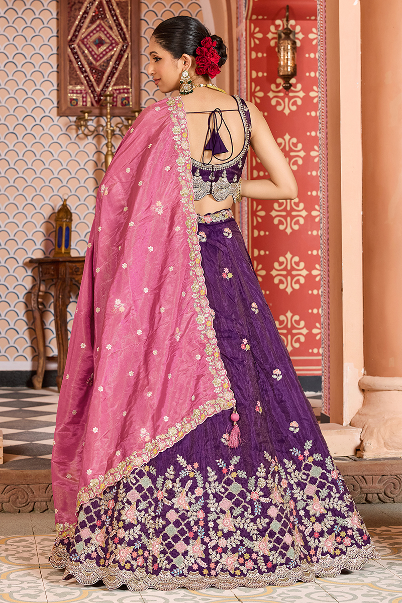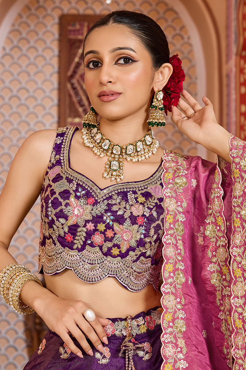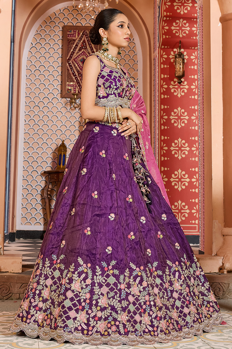 Add more glamour to your style with this beautiful Purple colored Designer Indo-Western Lehenga Choli. Shop online for this lehenga choli crafted from Tissue fabric embellished with Sequin, Stone, and Coding Work. Has a Thread Cut Work Border on the Hemline. The lehenga has a double shantoon inner with layer of can can 18 inches with 2 layers of Buckram 5 and 10 inches. The latkan adds a charm to the lehenga composed of hand-made round-shaped tassel, with ethnic work hanging beads latkan. The flare of the lehenga is 3.5 meters and the length is 42 inches. The waist and the bust of the lehenga and choli are customizable up to 40 and 42 inches. Complete your look with ethnic jewelry and heels. The ensemble includes a Pink colored, Tissue fabric dupatta embellished with heavy coding with an embroidery border work. The length of the dupatta is 2.5 meters and the width is 1 meter. Please note that color variations may occur due to digital photography, and the accessories shown are for illustrative purposes only.