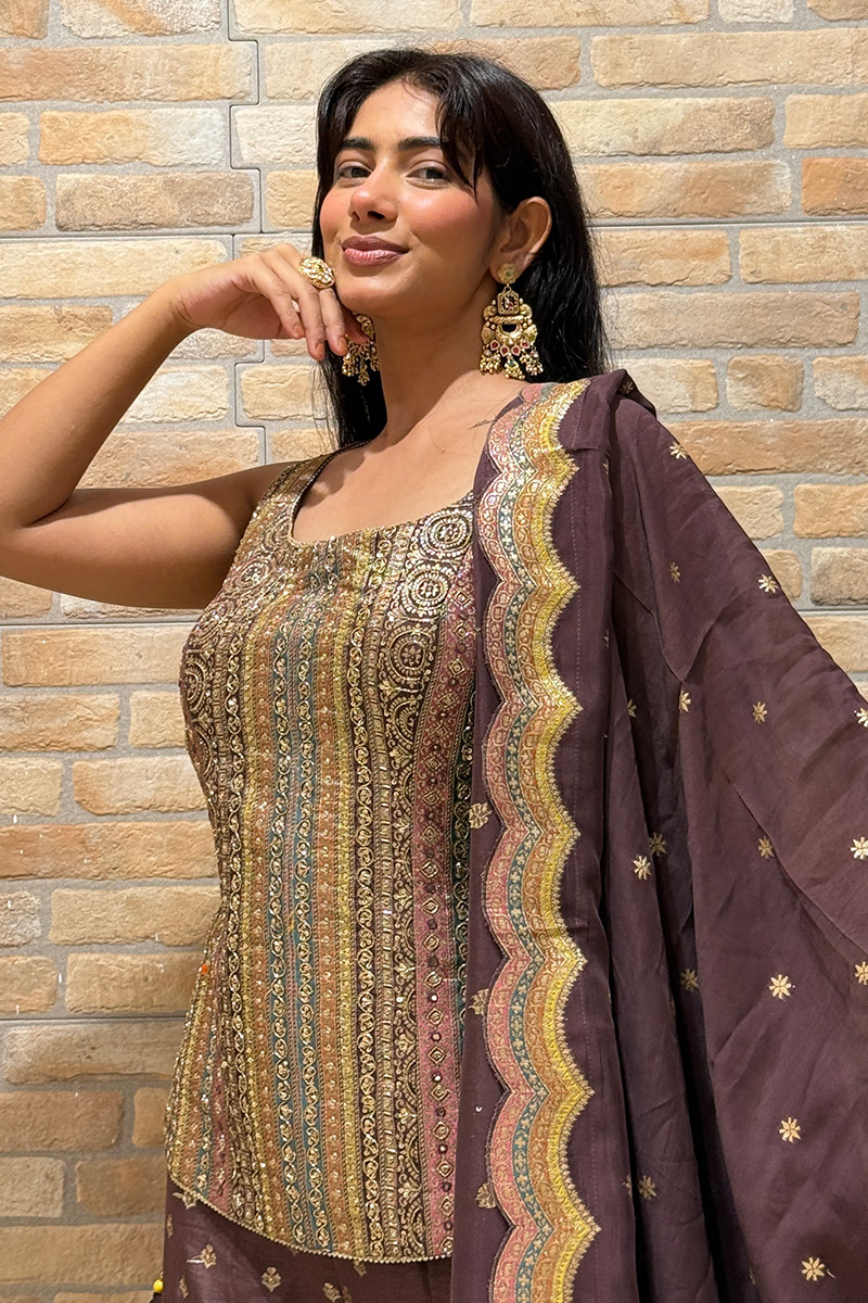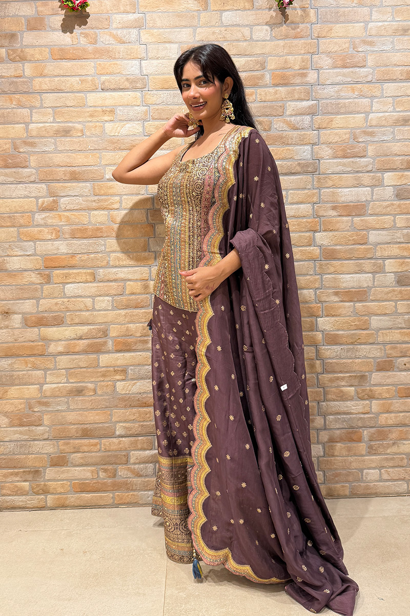 Add more glamour to your style with this beautiful Wine designer palazzo suit. Order this suit crafted from Silk fabric, which features Heavy Embroidery Work. Enhance your ensemble with ethnic jewelry and a pair of heels for a sophisticated touch. The suit comes with a matching dupatta and a palazzo bottom made from Georgette fabric. Please be aware that slight color variations may occur due to digital photography, and the accessories shown are only for illustration.