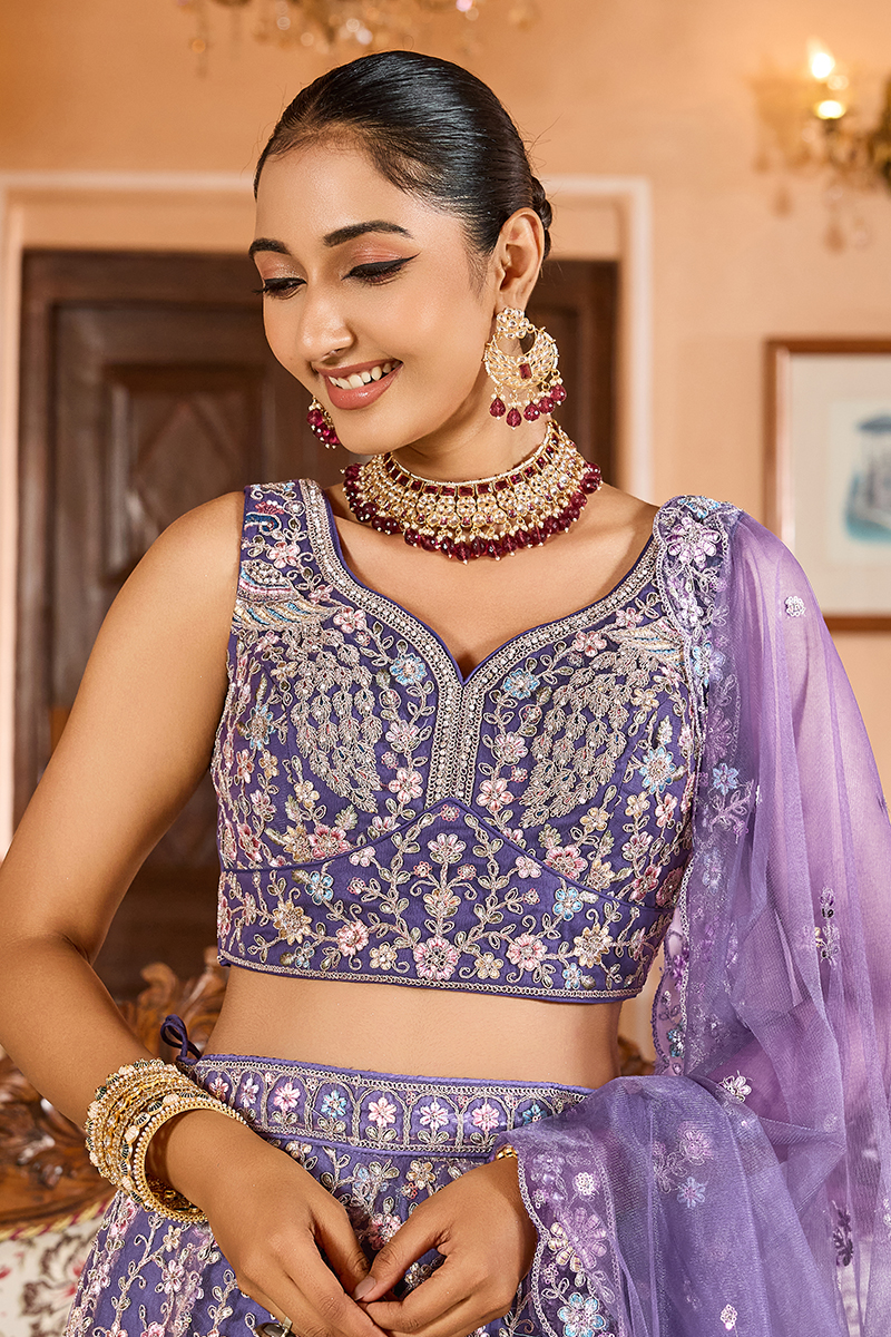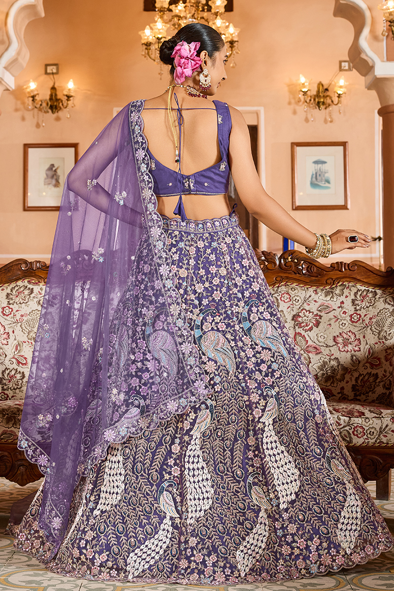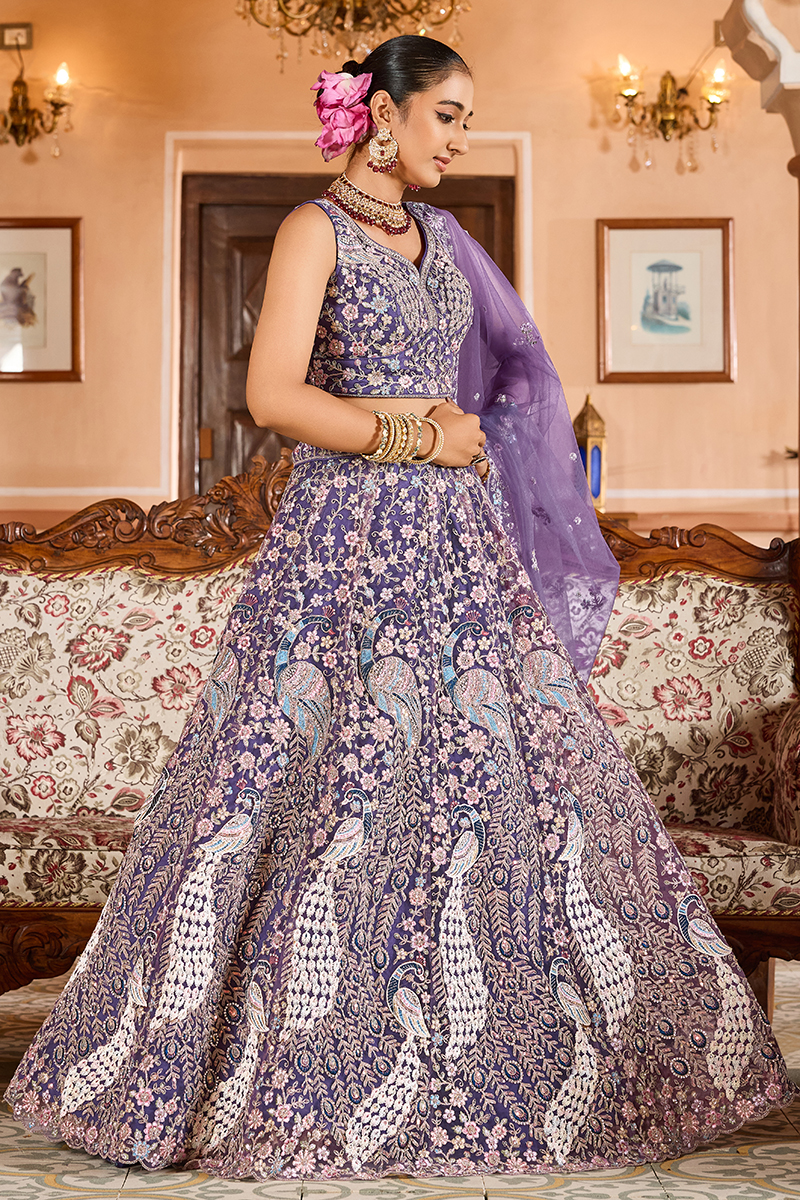 Looking for a way to diversify your attire for the day? Then go ahead and wear this alluring Purple colored Designer Indo-Western Lehenga Choli. Shop online for this lehenga choli crafted from Net fabric embellished with Sequin, Stone, and Coding Work. Has a Thread Cut Work Border on the Hemline. The lehenga has a double shantoon inner with layer of can can 18 inches with 2 layers of Buckram 3 and 10 inches. The flare of the lehenga is 3.5 meters and the length is 42 inches. The waist and the bust of the lehenga and choli are customizable up to 40 and 42 inches. Complete your look with ethnic jewelry and heels. The ensemble includes a matching, Net fabric dupatta embellished with heavy coding with an embroidery border work. The length of the dupatta is 2.5 meters and the width is 1 meter. Please note that color variations may occur due to digital photography, and the accessories shown are for illustrative purposes only.