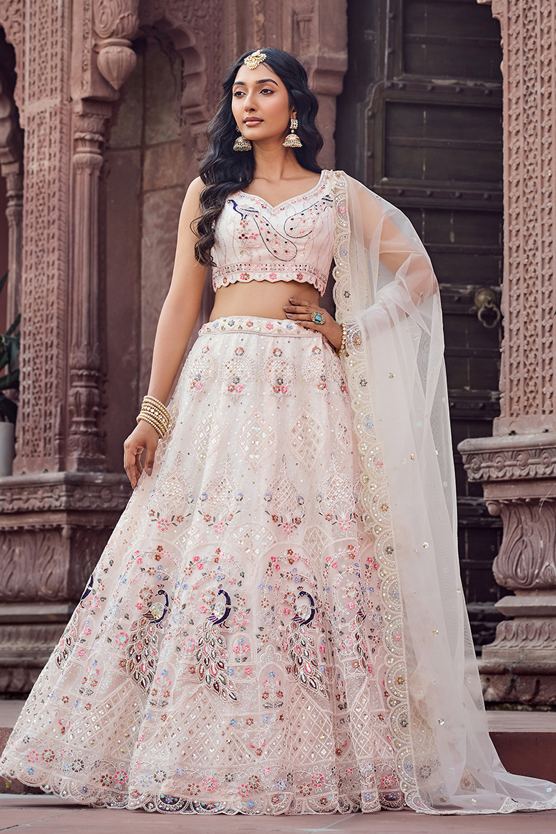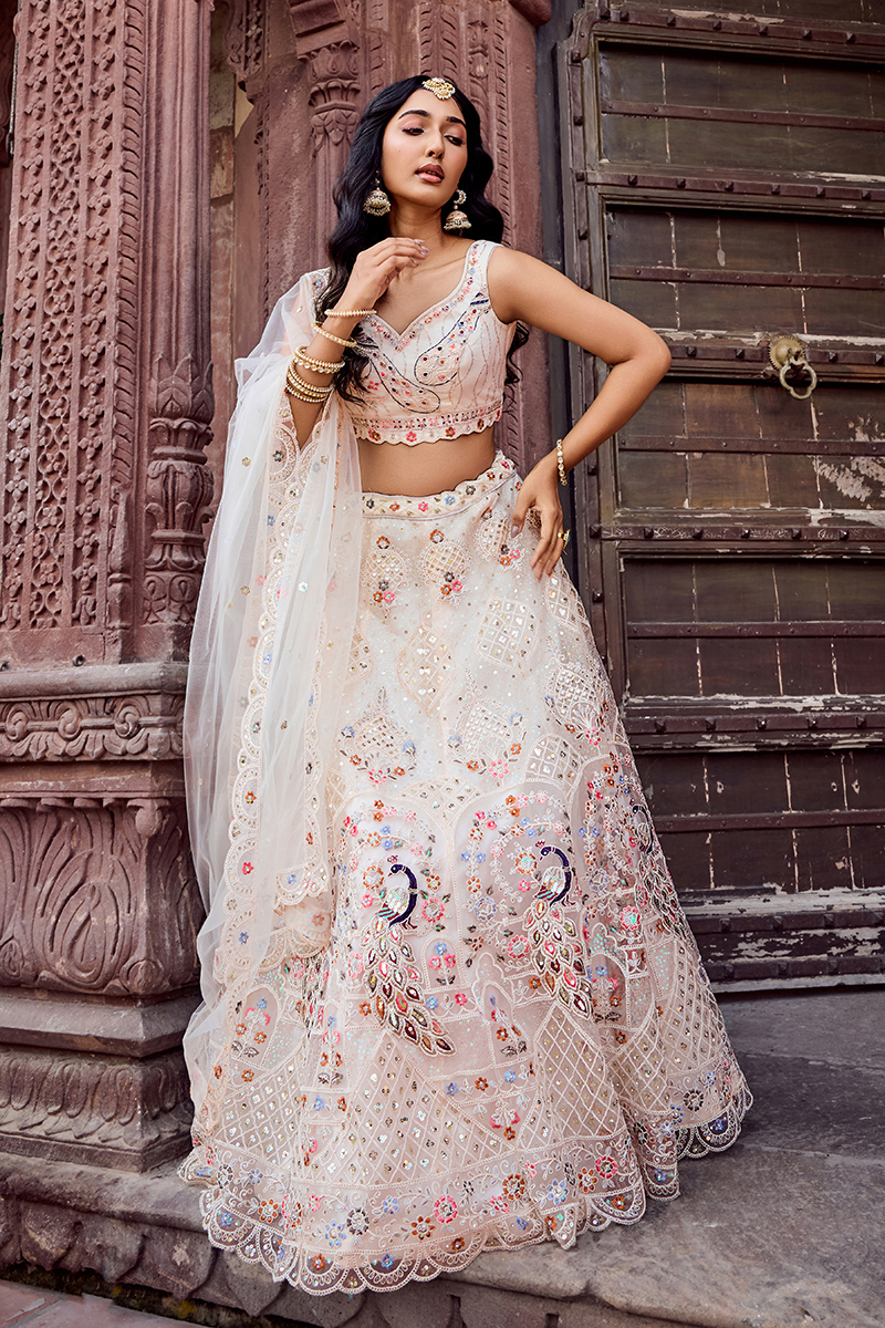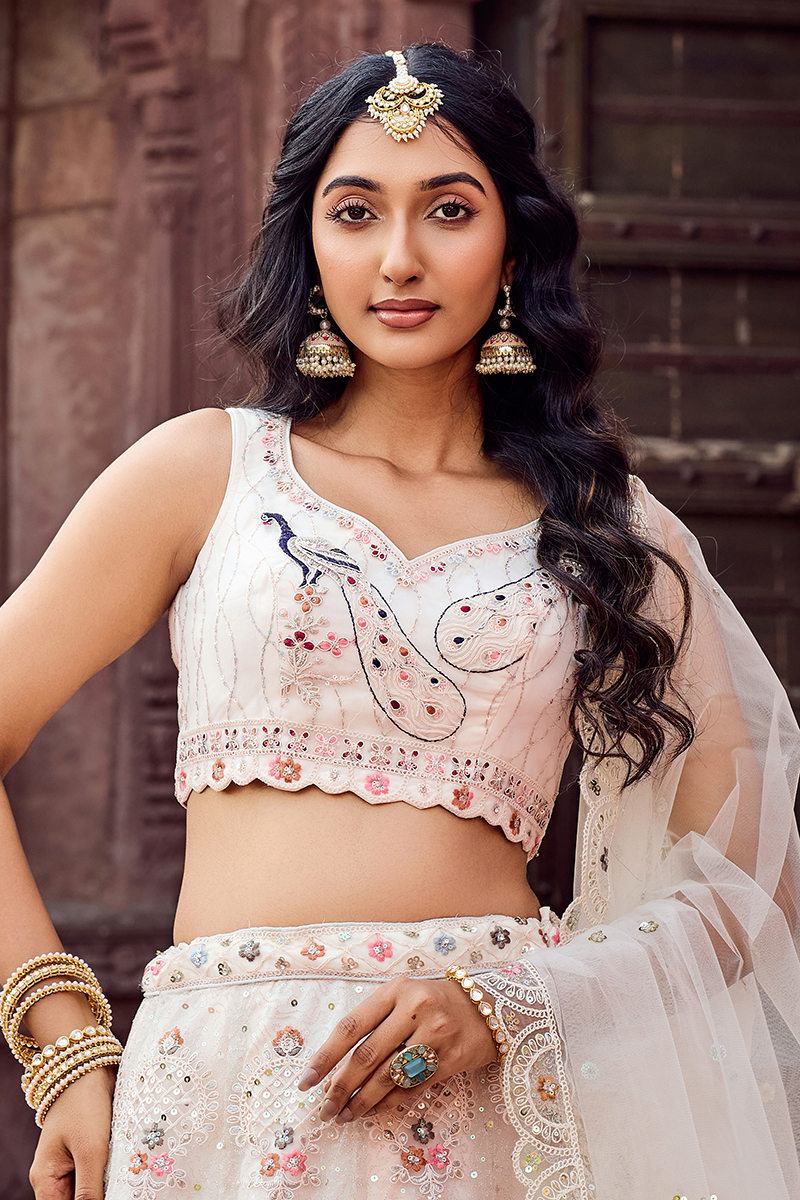 Boost your fashion style with this beautiful alluring Cream colored Designer Indo-Western Lehenga Choli. Collection of this lehenga choli crafted from Net fabric embellished with Sequin, Stone, and Coding Work. Has a Thread Cut Work Border on the Hemline. The lehenga has a double shantoon inner with layer of can can 18 inches with 2 layers of Buckram 3 and 10 inches. The flare of the lehenga is 3.5 meters and the length is 42 inches. The waist and the bust of the lehenga and choli are customizable up to 40 and 42 inches. Complete your look with ethnic jewelry and heels. The ensemble includes a matching, Net fabric dupatta embellished with heavy coding with an embroidery border work. The length of the dupatta is 2.5 meters and the width is 1 meter. Please note that color variations may occur due to digital photography, and the accessories shown are for illustrative purposes only.