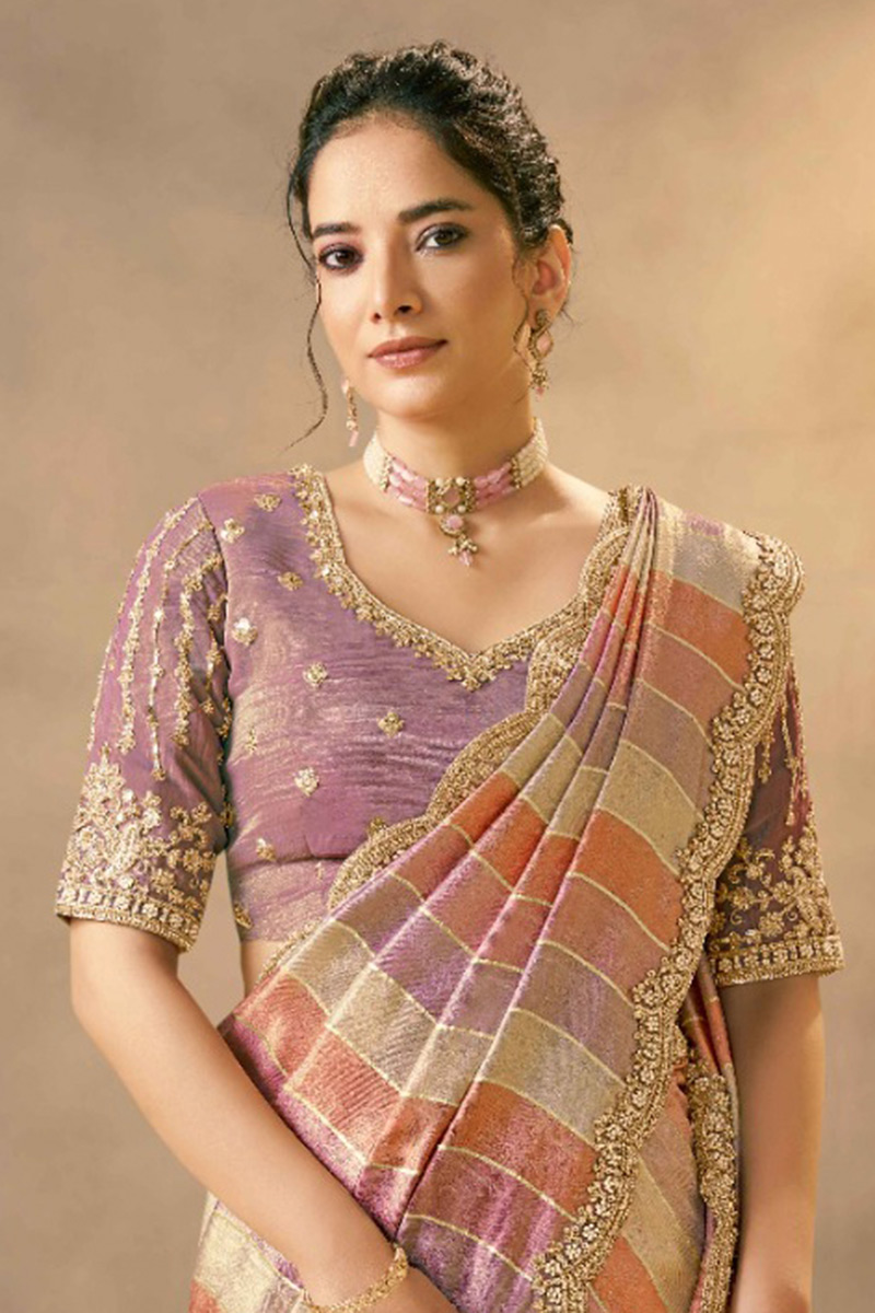 Lift your style quotient with this divine Multi colored designer saree. Shop Online for this saree which is made of Handwoven Banarasi Tissue fabric and is beautifully crafted with Pearls, Beads Embellishment, Scallops Work. Pair this saree with ethnic jewellery and a pair of heels to elevate your style. This saree comes with Lavender colored, Viscose Zari Silk fabric Blouse. Note slight color variation may be possible due to the digital photography. Accessories shown in the image is for photography purpose.