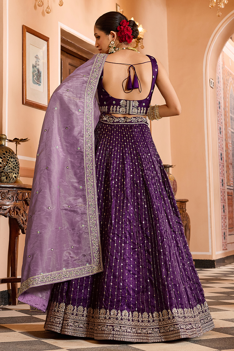 Fashion and style always depends on good color and fantastic combination of shades and so we create best shades to enhance your beauty and personality with this exclusive Purple colored Designer Indo-Western Lehenga Choli. Collection of this lehenga choli crafted from Tissue Silk fabric embellished with Sequin and Coding Work. Has a Zari Work on the Hemline. The lehenga has a double shantoon inner with layer of can can 18 inches with 2 layers of Buckram 5 and 10 inches. The latkan adds a charm to the lehenga composed of hand-made round-shaped tassel, with ethnic work hanging beads latkan. The flare of the lehenga is 3.8 meters and the length is 42 inches. The waist and the bust of the lehenga and choli are customizable up to 40 and 42 inches. Complete your look with ethnic jewelry and heels. The ensemble includes a Lavender colored, Tissue Silk fabric dupatta embellished with heavy coding with an embroidery border work. The length of the dupatta is 2.5 meters and the width is 1 meter. Please note that color variations may occur due to digital photography, and the accessories shown are for illustrative purposes only.