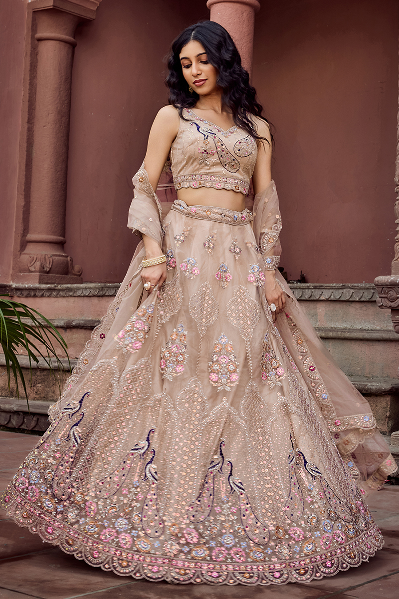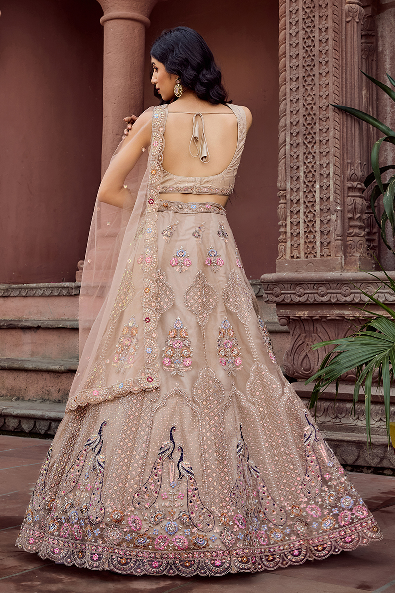 Get praised for your beauty and charm with this exotic Beige colored Designer Indo-Western Lehenga Choli. Order this lehenga choli crafted from Net fabric embellished with Sequin, Stone, and Coding Work. Has a Thread Cut Work Border on the Hemline. The lehenga has a double shantoon inner with layer of can can 18 inches with 2 layers of Buckram 5 and 10 inches. The flare of the lehenga is 3.5 meters and the length is 42 inches. The waist and the bust of the lehenga and choli are customizable up to 40 and 42 inches. Complete your look with ethnic jewelry and heels. The ensemble includes a matching, Net fabric dupatta embellished with heavy coding with an embroidery border work. The length of the dupatta is 2.5 meters and the width is 1 meter. Please note that color variations may occur due to digital photography, and the accessories shown are for illustrative purposes only.