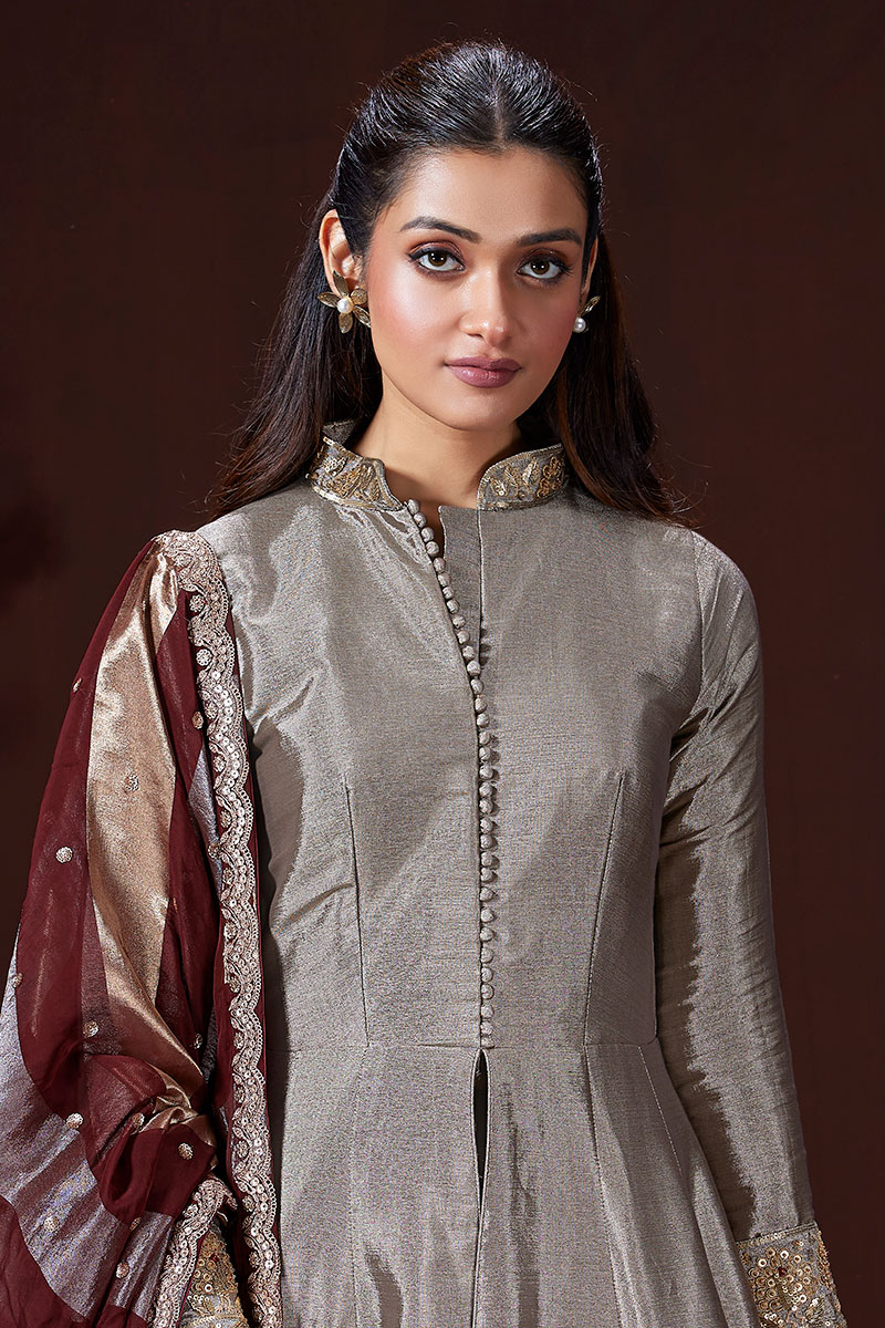 Get praised for your beauty and charm with this Grey and Gold colored designer Anarkali suit. Collection of this suit which is made of Dola Silk fabric and is beautifully crafted with Resham and Embroidery Work. Pair this suit with ethnic jewellery and a pair of heels to elevate your style. This suit comes with Brown colored, Chinon fabric dupatta. Note slight color variation may be possible due to the digital photography. Accessories shown in the image is for photography purpose.