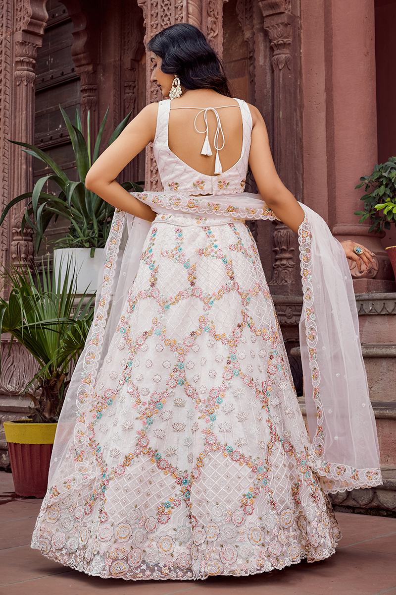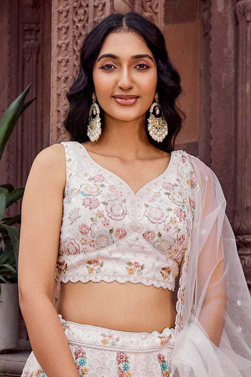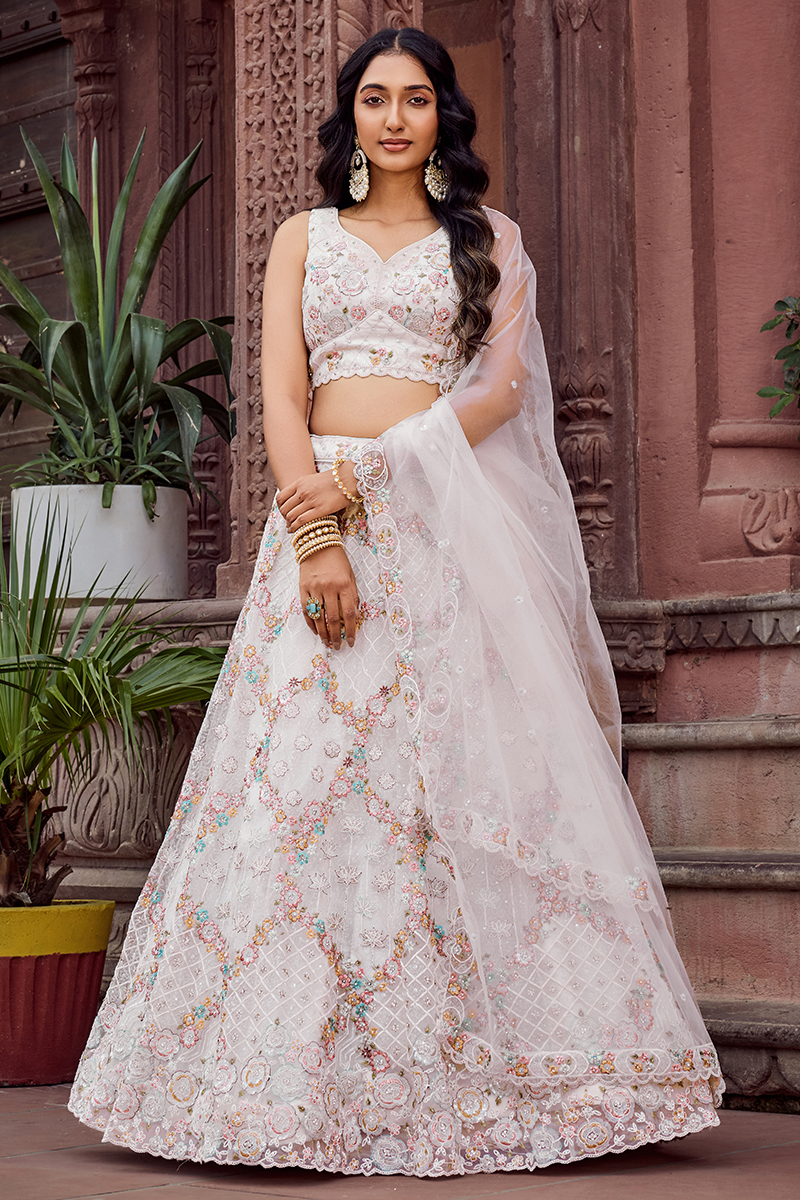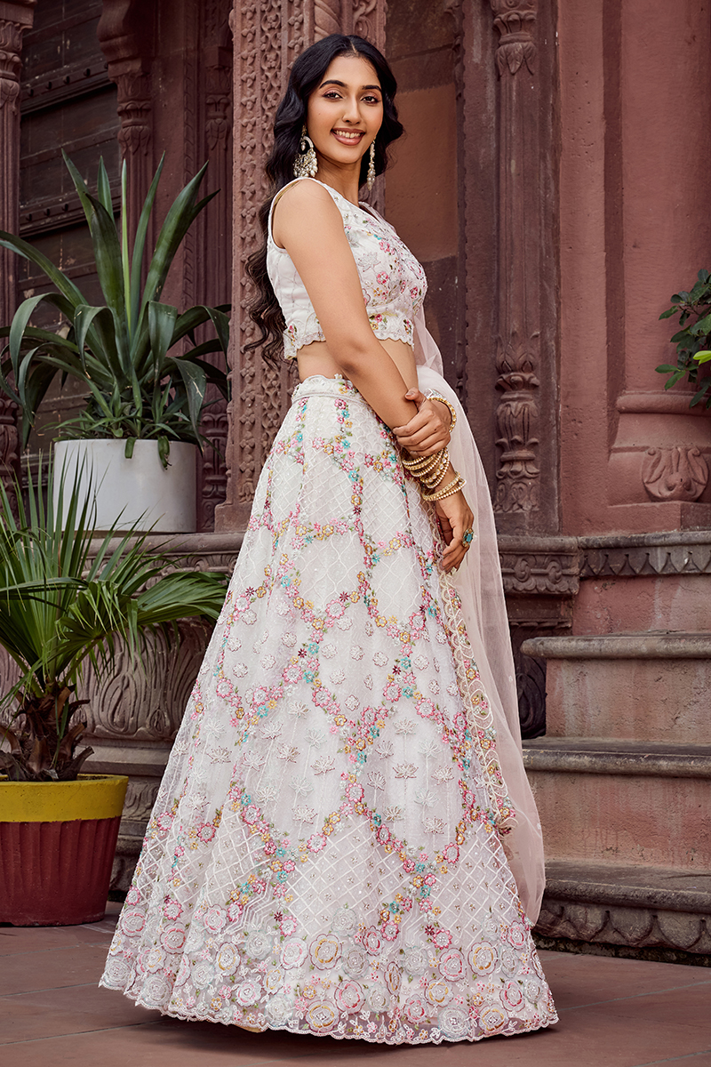 Get praised for your beauty and charm with this Cream colored Designer Indo-Western Lehenga Choli. Shop online for this lehenga choli crafted from Net fabric embellished with Sequin, Stone, and Coding Work. Has a Thread Cut Work Border on the Hemline. The lehenga has a double shantoon inner with layer of can can 18 inches with 2 layers of Buckram 3 and 10 inches. The flare of the lehenga is 3.5 meters and the length is 42 inches. The waist and the bust of the lehenga and choli are customizable up to 40 and 42 inches. Complete your look with ethnic jewelry and heels. The ensemble includes a matching, Net fabric dupatta embellished with heavy coding with an embroidery border work. The length of the dupatta is 2.5 meters and the width is 1 meter. Please note that color variations may occur due to digital photography, and the accessories shown are for illustrative purposes only.
