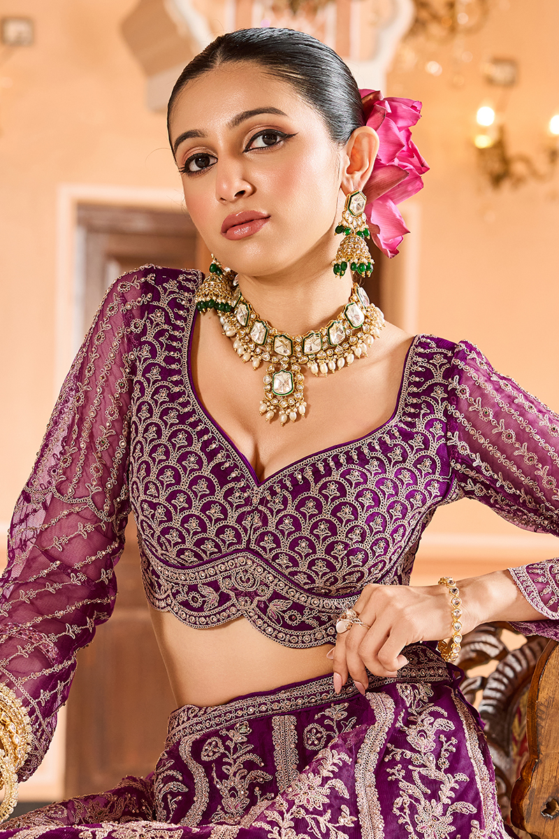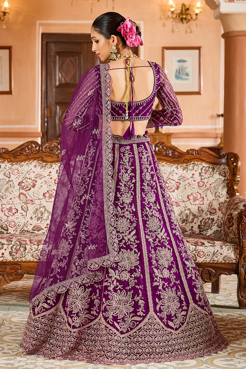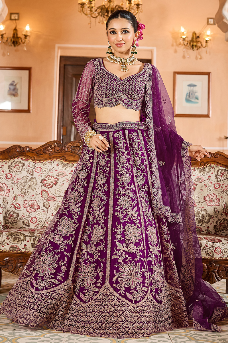 Add more glamour to your style with this alluring Burgundy colored Designer Wedding Lehenga Choli. Order this lehenga choli crafted from Net fabric embellished with Sequin, Stone, and Coding Work. Has a Thread Cut Work Border on the Hemline. The lehenga has a double shantoon inner with 2 layers of can can 24 and 9 inches with 2 layers of Buckram 3 and 10 inches. The flare of the lehenga is 3.5 meters and the length is 42 inches. The waist and the bust of the lehenga and choli are customizable up to 40 and 42 inches. Complete your look with ethnic jewelry and heels. The ensemble includes a matching, Net fabric dupatta embellished with heavy coding with an embroidery border work. The length of the dupatta is 2.5 meters and the width is 1 meter. Please note that color variations may occur due to digital photography, and the accessories shown are for illustrative purposes only.