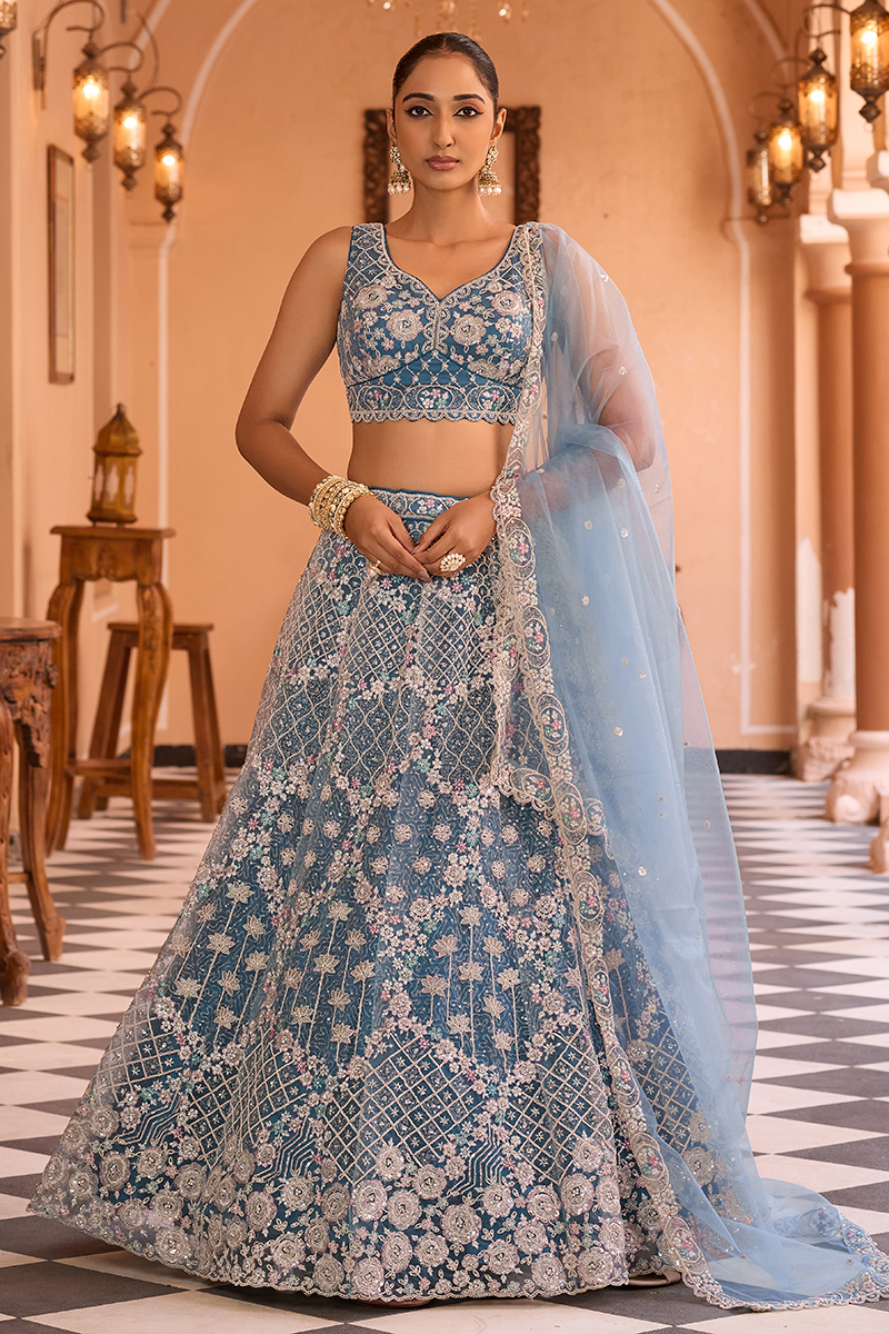 Be the starlight of any event with this beautiful Teal colored Designer Indo-Western Lehenga Choli. Buy this lehenga choli crafted from Net fabric embellished with Sequin, Stone, and Coding Work. Has a Thread Cut Work Border on the Hemline. The lehenga has a double shantoon inner with layer of can can 18 inches with 2 layers of Buckram 3 and 10 inches. The flare of the lehenga is 3.5 meters and the length is 42 inches. The waist and the bust of the lehenga and choli are customizable up to 40 and 42 inches. Complete your look with ethnic jewelry and heels. The ensemble includes a matching, Net fabric dupatta embellished with heavy coding with an embroidery border work. The length of the dupatta is 2.5 meters and the width is 1 meter. Please note that color variations may occur due to digital photography, and the accessories shown are for illustrative purposes only.