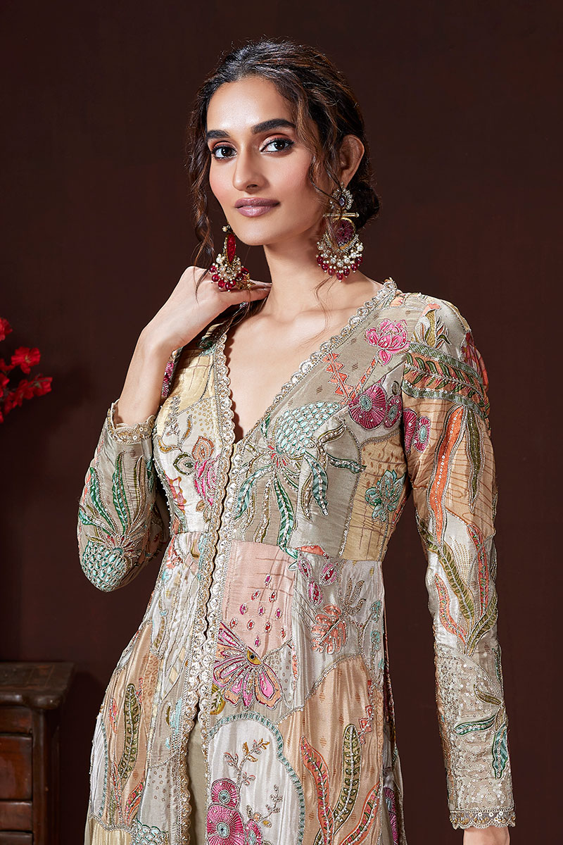 The starlight of any event with this beautiful Multi colored designer palazzo suit. Shop online for this suit crafted from Silk fabric which features Printed and Embroidery Work. Enhance your ensemble with ethnic jewelry and a pair of heels for a sophisticated touch. The suit comes with a Golden palazzo bottom made from Silk fabric. Please be aware that slight color variations may occur due to digital photography, and the accessories shown are only for illustration.