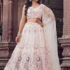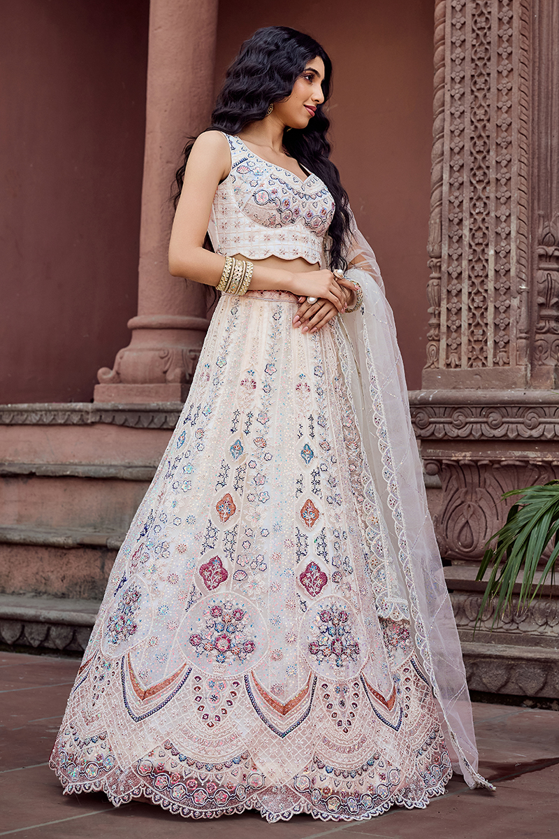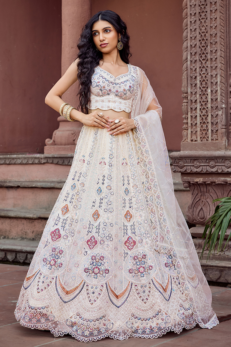 Boost your fashion style with this beautiful Cream colored Designer Indo-Western Lehenga Choli. Buy this lehenga choli crafted from Net fabric embellished with Sequin, Stone, and Coding Work. Has a Thread Cut Work Border on the Hemline. The lehenga has a double shantoon inner with layer of can can 18 inches with 2 layers of Buckram 3 and 10 inches. The flare of the lehenga is 3.5 meters and the length is 42 inches. The waist and the bust of the lehenga and choli are customizable up to 40 and 42 inches. Complete your look with ethnic jewelry and heels. The ensemble includes a matching, Net fabric dupatta embellished with heavy coding with an embroidery border work. The length of the dupatta is 2.5 meters and the width is 1 meter. Please note that color variations may occur due to digital photography, and the accessories shown are for illustrative purposes only.