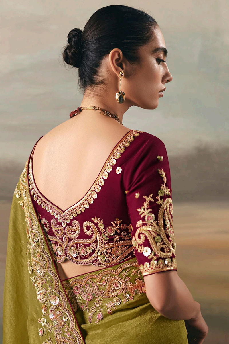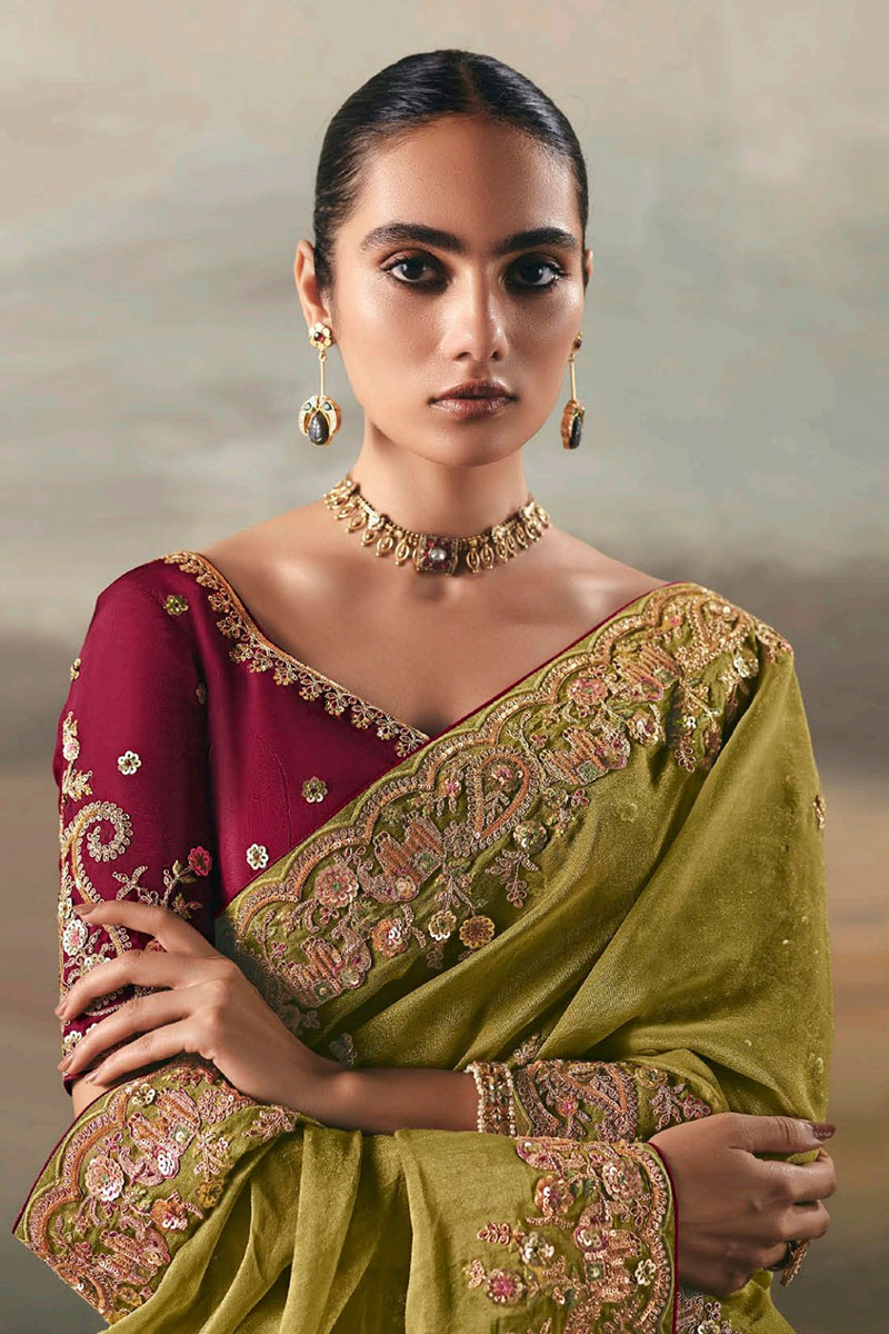 Boost your fashion style with this beautiful Parrot Green colored designer saree. Shop online for this saree which is made of Premium Tissue Silk fabric and is beautifully crafted with Heavy Zari, Resham, Thread, Sequin Embroidery, Pearl with Mirror, Stone, and Lace Border Work. Pair this saree with ethnic jewellery and a pair of heels to elevate your style. This saree comes with a Maroon colored, Pure Silk blouse fabric. Note slight color variation may be possible due to the digital photography. Accessories shown in the image is for photography purpose.