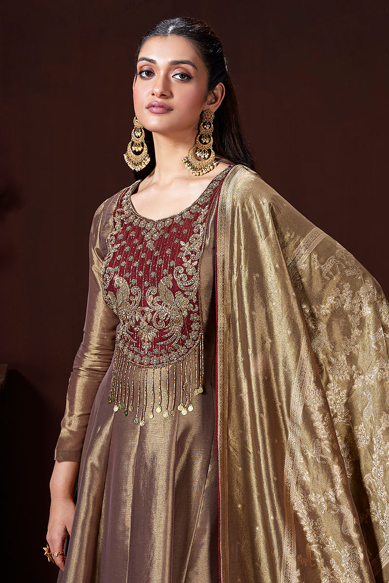 Enhance your fashion style with this exclusive Golden colored designer palazzo suit. Collection of this suit crafted from Banarasi Silk fabric which features Resham, Weaving Printed and Embroidery Work. Enhance your ensemble with ethnic jewelry and a pair of heels for a sophisticated touch. The suit comes with a matching palazzo bottom and a dupatta made from Banarasi Silk fabric. Please be aware that slight color variations may occur due to digital photography, and the accessories shown are only for illustration.