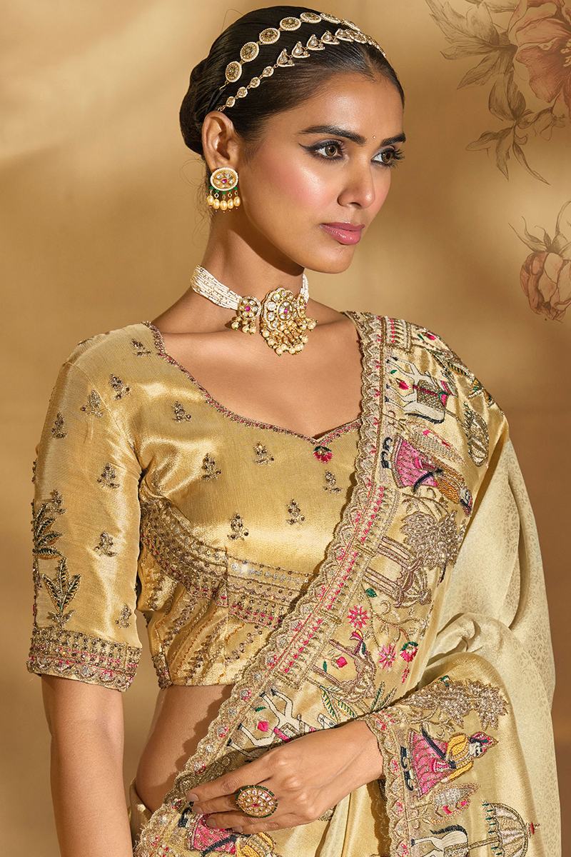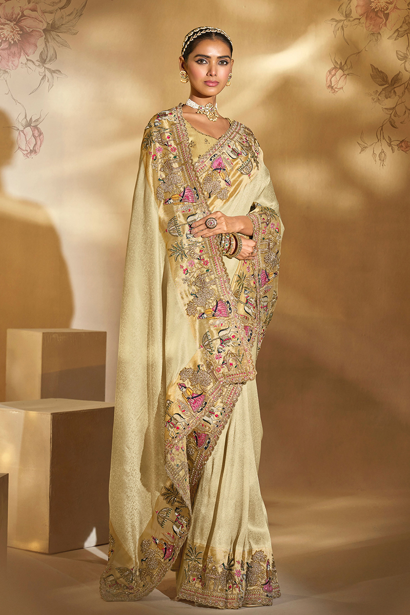 Enhance your fashion style with this exclusive Cream colored designer saree. Buy this saree which is made of Pure Ziraf Silk fabric and is beautifully crafted with Heavy Zari, Thread, Cut-Dana, Moti with Original Mirror and Lace Border Work. Pair this saree with ethnic jewellery and a pair of heels to elevate your style. This saree comes with a Beige colored, Pure Ziraf Silk blouse fabric. Note slight color variation may be possible due to the digital photography. Accessories shown in the image is for photography purpose.