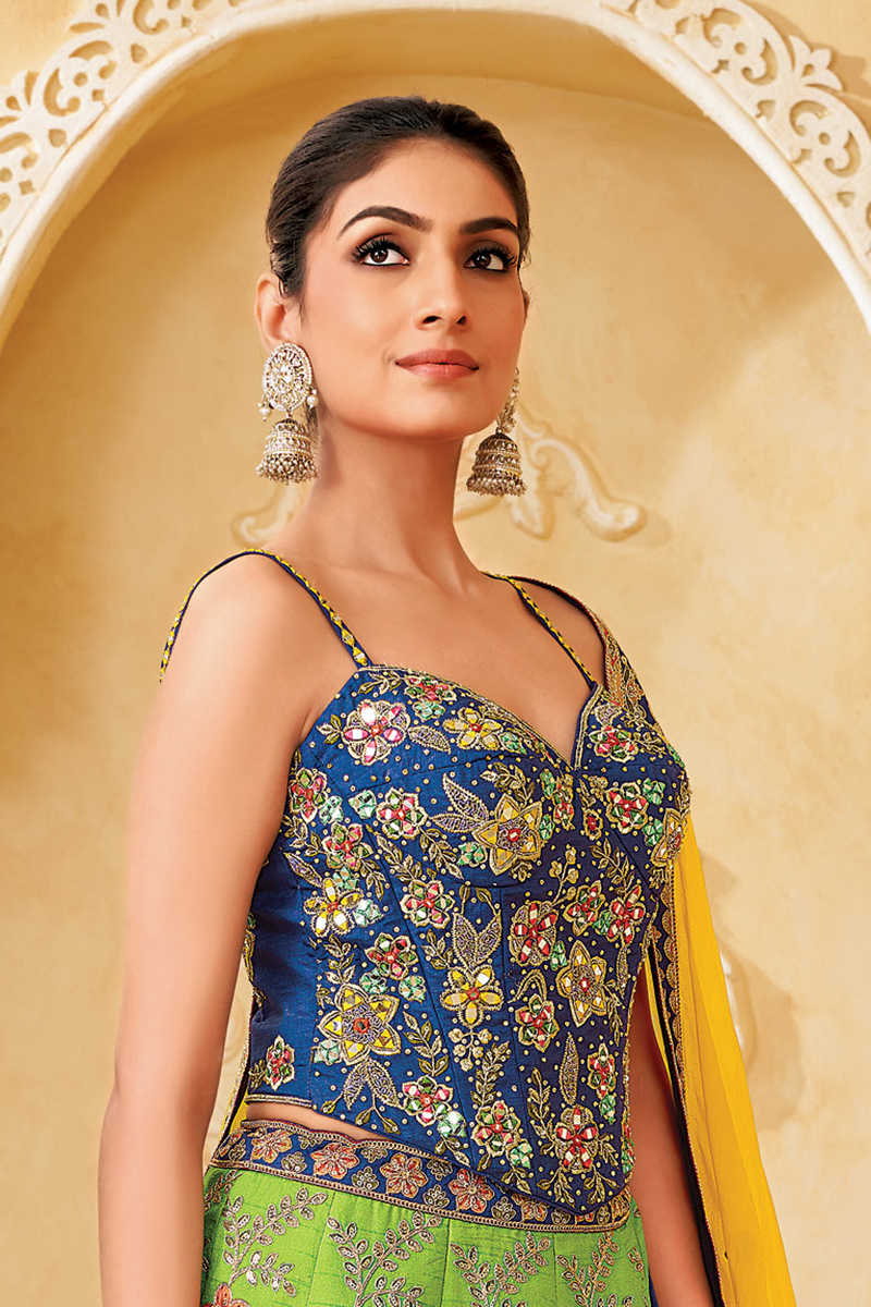 Get praised for your beauty and charm with this heavenly Multi colored designer Indo-Western Lehenga and Navy Blue colored Choli. Shop online for this lehenga choli crafted from Silk fabric embellished with Printed, Sequin, Mirror, and Thread Embroidery Work. The latkan adds a charm to the lehenga composed of hand-made round-shaped tassel, with ethnic work hanging beads latkan. Complete your look with ethnic jewelry and heels. The ensemble includes a Yellow colored, Silk fabric dupatta. Please note that color variations may occur due to digital photography, and the accessories shown are for illustrative purposes only.
