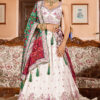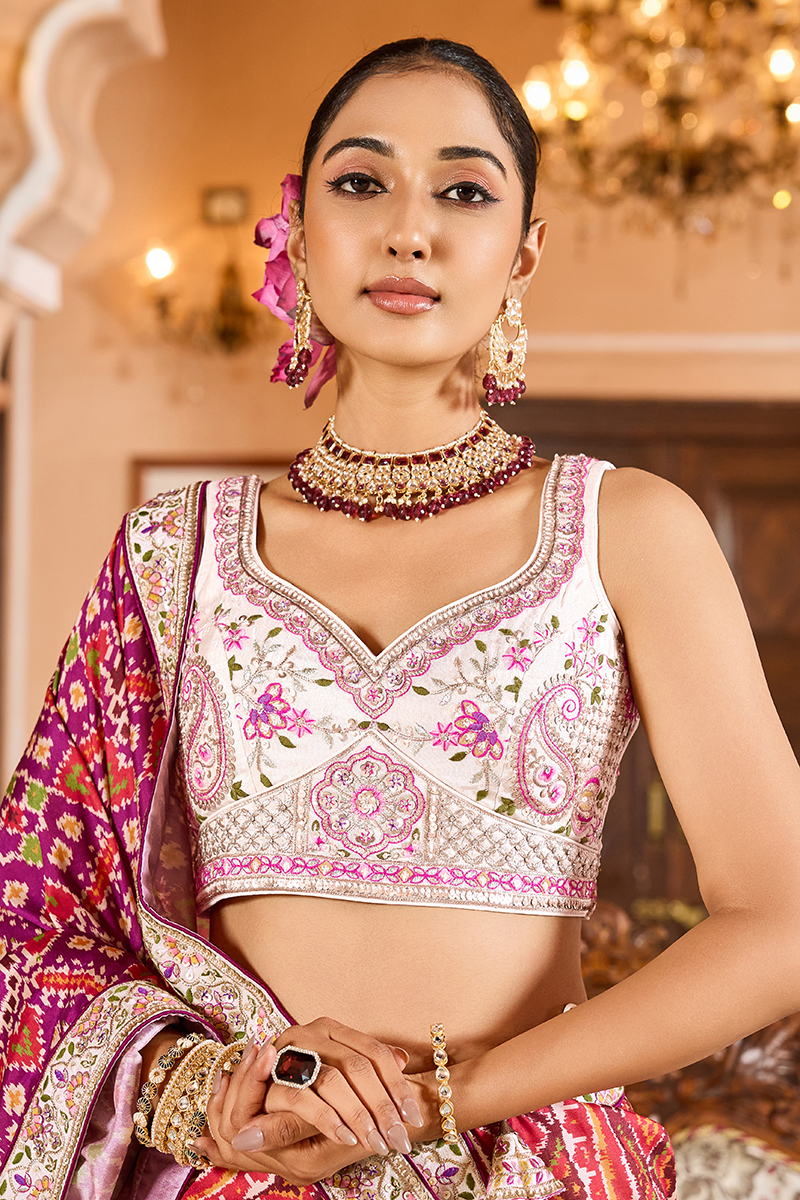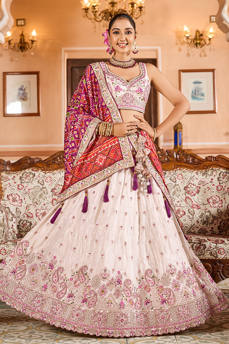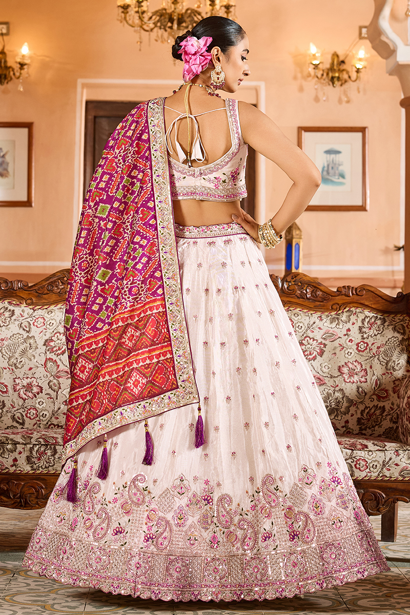 Get praised for your beauty and charm with this heavenly Cream colored Designer Indo-Western Lehenga Choli. Shop online for this lehenga choli crafted from Tissue fabric embellished with Sequin, Zari, and Coding Work. Has a Thread Cut Work Border on the Hemline. The lehenga has a double shantoon inner with layer of can can 18 inches with 2 layers of Buckram 5 and 12 inches. The latkan adds a charm to the lehenga composed of hand-made round-shaped tassel, with ethnic work hanging beads latkan. The flare of the lehenga is 3.5 meters and the length is 42 inches. The waist and the bust of the lehenga and choli are customizable up to 40 and 42 inches. Complete your look with ethnic jewelry and heels. The ensemble includes a Burgundy colored, Patola Print fabric dupatta embellished with heavy zari with an embroidery, tapping border work. The length of the dupatta is 2.5 meters and the width is 1 meter. Please note that color variations may occur due to digital photography, and the accessories shown are for illustrative purposes only.