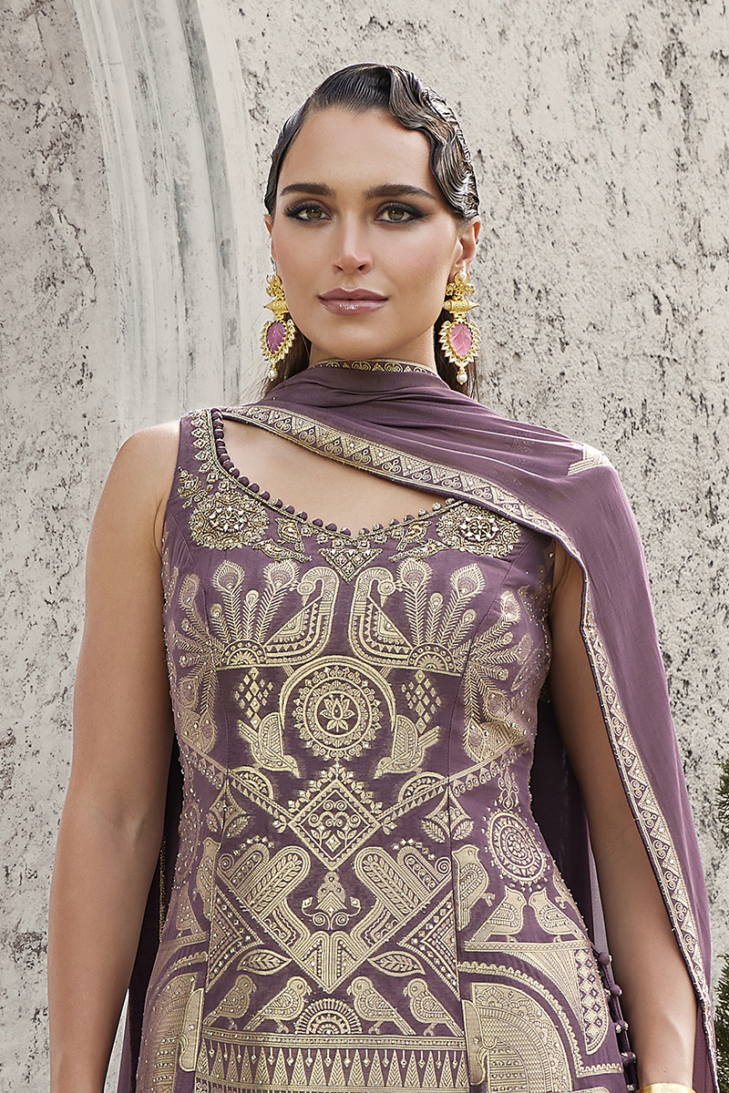 Update your clothing style as per the latest trend with this beautiful Wine designer palazzo suit. Order this suit crafted from Silk fabric, which features Weaving and Thread Embroidery Work. Enhance your ensemble with ethnic jewelry and a pair of heels for a sophisticated touch. The suit comes with a matching dupatta and a palazzo bottom made from Silk fabric. Please be aware that slight color variations may occur due to digital photography, and the accessories shown are only for illustration.