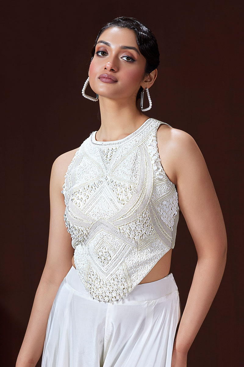 Style and trend will be at the peak of your beauty when you wear this exotic White colored designer palazzo suit. Shop online for this suit crafted from Silk fabric which features Embroidery Work. Enhance your ensemble with ethnic jewelry and a pair of heels for a sophisticated touch. The suit comes with a matching palazzo bottom made from Silk fabric. Please be aware that slight color variations may occur due to digital photography, and the accessories shown are only for illustration.