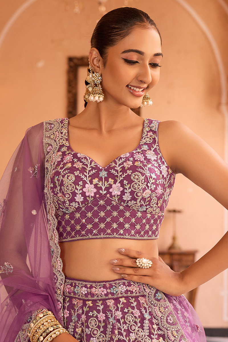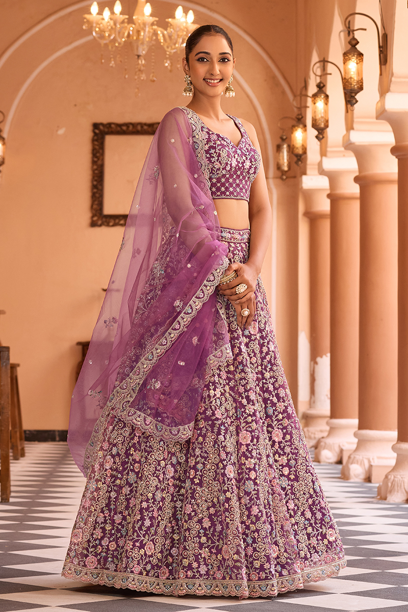 Be the starlight of any event with this attractive Burgundy colored Designer Indo-Western Lehenga Choli. Order this lehenga choli crafted from Net fabric embellished with Sequin, Stone, and Coding Work. Has a Thread Cut Work Border on the Hemline. The lehenga has a double shantoon inner with layer of can can 18 inches with 2 layers of Buckram 3 and 10 inches. The flare of the lehenga is 3.5 meters and the length is 42 inches. The waist and the bust of the lehenga and choli are customizable up to 40 and 42 inches. Complete your look with ethnic jewelry and heels. The ensemble includes a matching, Net fabric dupatta embellished with heavy coding with an embroidery border work. The length of the dupatta is 2.5 meters and the width is 1 meter. Please note that color variations may occur due to digital photography, and the accessories shown are for illustrative purposes only.