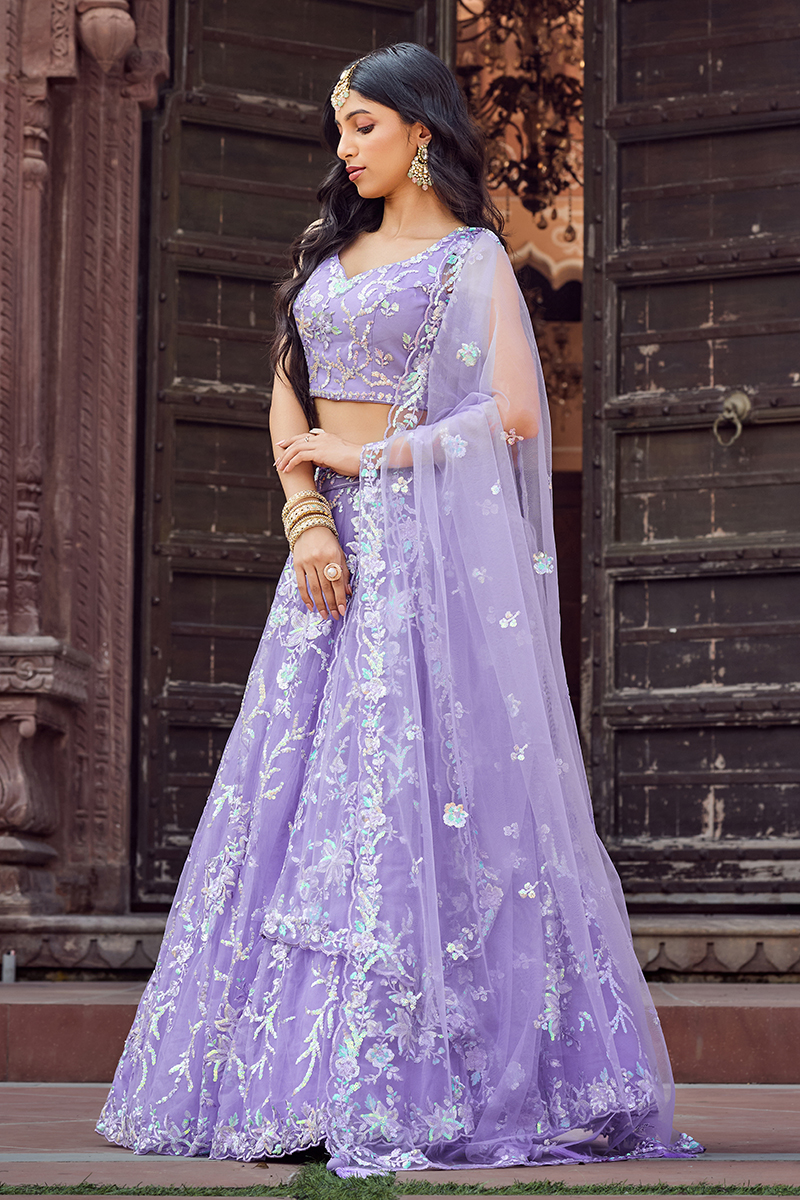 Feel comfortable without compromising on style by wearing this ravishing Mauve colored Designer Indo-Western Lehenga Choli. Collection of this lehenga choli crafted from Net fabric embellished with Sequin, Stone, and Coding Work. Has a Thread Cut Work Border on the Hemline. The lehenga has a double shantoon inner with layer of can can 18 inches with 2 layers of Buckram 5 and 10 inches. The flare of the lehenga is 3.5 meters and the length is 42 inches. The waist and the bust of the lehenga and choli are customizable up to 40 and 42 inches. Complete your look with ethnic jewelry and heels. The ensemble includes a matching, Net fabric dupatta embellished with heavy coding with an embroidery border work. The length of the dupatta is 2.5 meters and the width is 1 meter. Please note that color variations may occur due to digital photography, and the accessories shown are for illustrative purposes only.