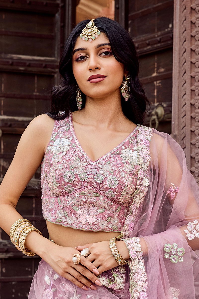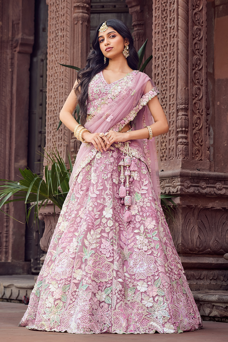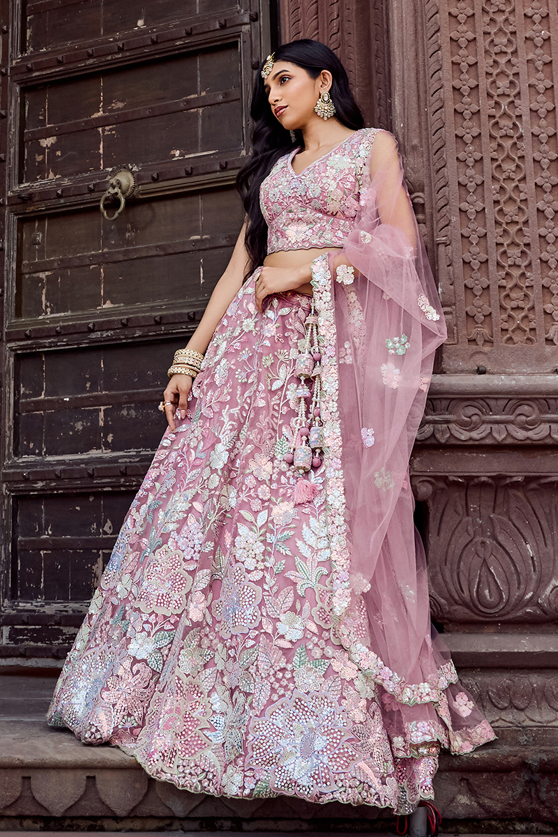 Feel comfortable without compromising on style by wearing this ravishing Pink colored Designer Indo-Western Lehenga Choli. Order this lehenga choli crafted from Net fabric embellished with Sequin, Stone, and Coding Work. Has a Thread Cut Work Border on the Hemline. The lehenga has a double shantoon inner with layer of can can 18 inches with 2 layers of Buckram 5 and 10 inches. The latkan adds a charm to the lehenga composed of hand-made round-shaped tassel, with ethnic work hanging beads latkan. The flare of the lehenga is 3.8 meters and the length is 42 inches. The waist and the bust of the lehenga and choli are customizable up to 40 and 42 inches. Complete your look with ethnic jewelry and heels. The ensemble includes a matching, Net fabric dupatta embellished with heavy coding with an embroidery border work. The length of the dupatta is 2.5 meters and the width is 1 meter. Please note that color variations may occur due to digital photography, and the accessories shown are for illustrative purposes only.