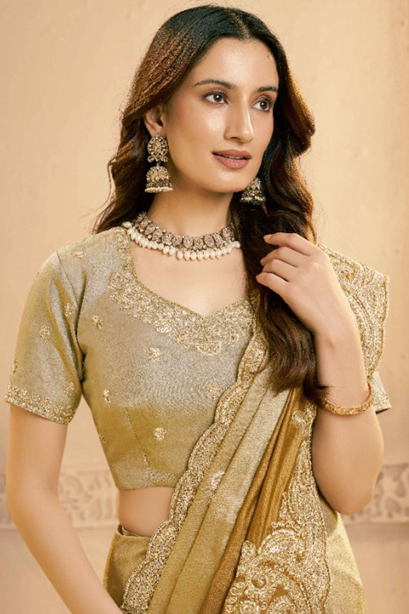 Get praised for your beauty and charm with this heavenly Multi colored designer saree. Collection of this saree which is made of Metallic Kora Zari Silk fabric and is beautifully crafted with Sandwich Sequins, Beads Work, Scallops Work. Pair this saree with ethnic jewellery and a pair of heels to elevate your style. This saree comes with Beige colored, Metallic Kora Zari Silk fabric Blouse. Note slight color variation may be possible due to the digital photography. Accessories shown in the image is for photography purpose.