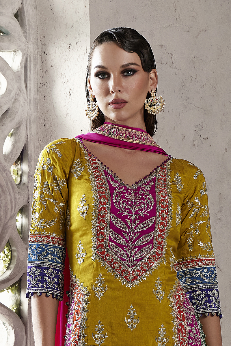 Spread the aura of freshness with this beautiful Mustard colored designer gharara suit. Order this suit crafted from Satin fabric, which features Weaving Print and Embroidery Work. Enhance your ensemble with ethnic jewelry and a pair of heels for a sophisticated touch. The suit comes with a Pink colored dupatta and matching gharara bottom made from Satin fabric. Please be aware that slight color variations may occur due to digital photography, and the accessories shown are only for illustration.