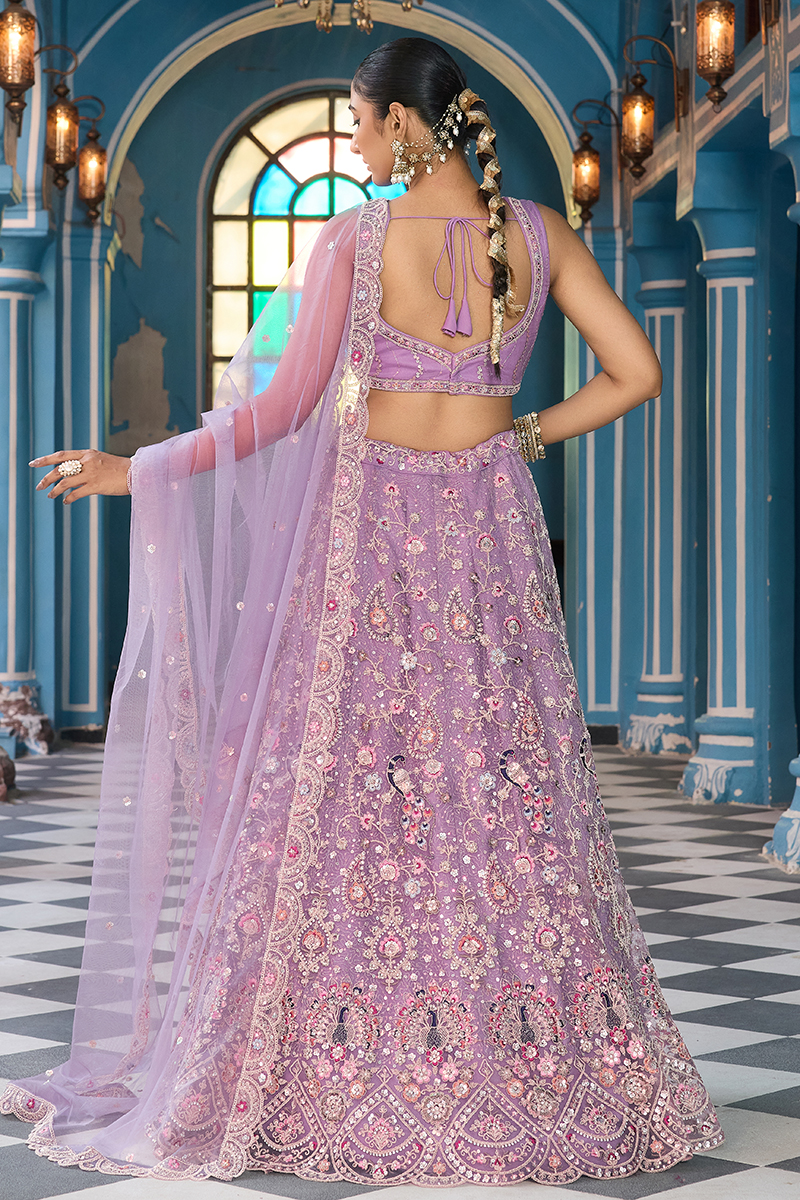 Boost your fashion style with this alluring Mauve colored Designer Indo-Western Lehenga Choli. Collection of this lehenga choli crafted from Net fabric embellished with Sequin, Stone, and Coding Work. Has a Thread Cut Work Border on the Hemline. The lehenga has a double shantoon inner with layer of can can 18 inches with 2 layers of Buckram 3 and 10 inches. The flare of the lehenga is 3.5 meters and the length is 42 inches. The waist and the bust of the lehenga and choli are customizable up to 40 and 42 inches. Complete your look with ethnic jewelry and heels. The ensemble includes a matching, Net fabric dupatta embellished with heavy coding with an embroidery border work. The length of the dupatta is 2.5 meters and the width is 1 meter. Please note that color variations may occur due to digital photography, and the accessories shown are for illustrative purposes only.