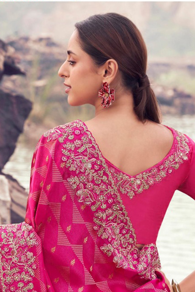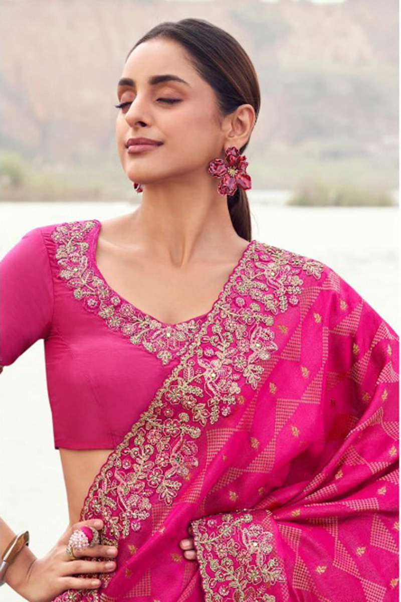 Boost your fashion style with this alluring Rani colored designer saree. Shop Online for this saree which is made of Pure Satin Silk With Jacquard fabric and is beautifully crafted with Embroidery Work. Pair this saree with ethnic jewellery and a pair of heels to elevate your style. This saree comes with Rani coloured, Pure Satin Silk fabric Blouse. Note slight color variation may be possible due to the digital photography. Accessories shown in the image is for photography purpose.