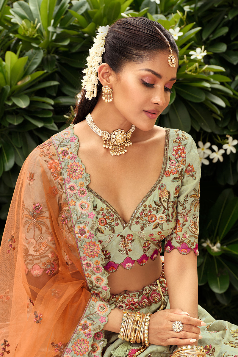 Boost your fashion style with this alluring Sea Green colored designer Lehenga Choli. Shop online for this Lehenga Choli which is made of Pure Silk fabric and is beautifully crafted with Weaving Print with Heavy Zari, Resham Embroidery, Art Mirror and Lace Border work. The latkan adds a charm to the lehenga composed of hand-made round-shaped tassel with ethnic work hanging beads latkan. Pair this Lehenga Choli with ethnic jewellery and a pair of heels to elevate your style. This Lehenga Choli comes with an Light Orange colored, Net fabric dupatta. Note slight color variation may be possible due to the digital photography. Accessories shown in the image is for photography purpose.