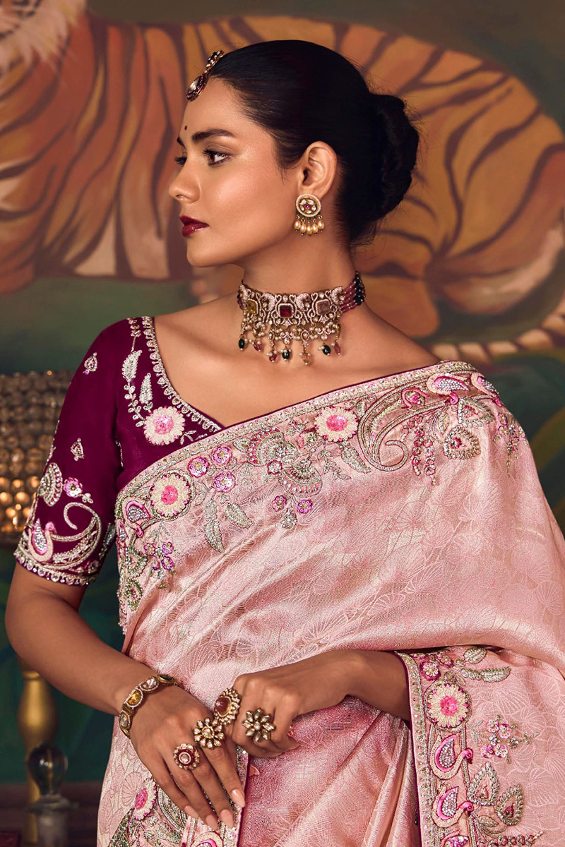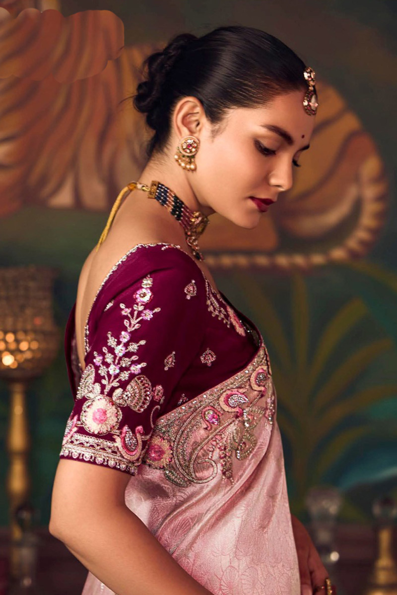 Boost your fashion style with this alluring Baby Pink colored designer saree. Shop Online for this saree which is made of Silk fabric and is beautifully crafted with Heavy Embroidery Work. Pair this saree with ethnic jewellery and a pair of heels to elevate your style. This saree comes with Burgundy Colored, Silk fabric Blouse. Note slight color variation may be possible due to the digital photography. Accessories shown in the image is for photography purpose.