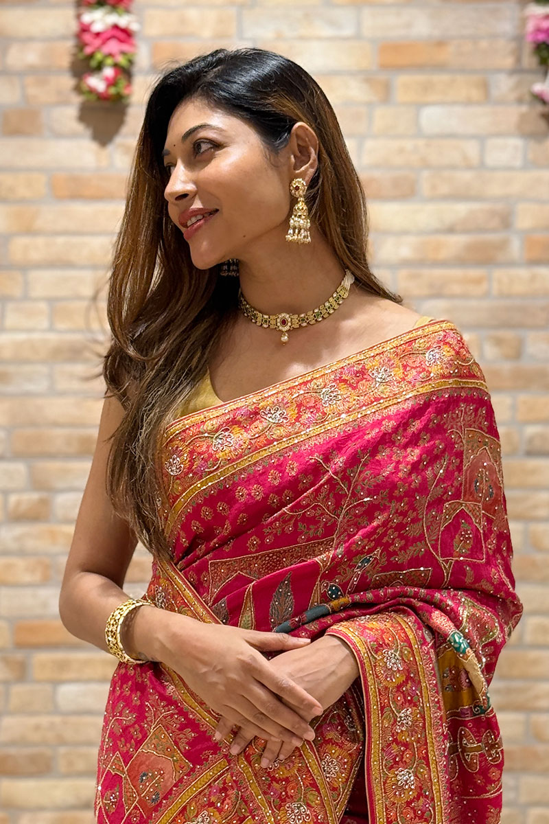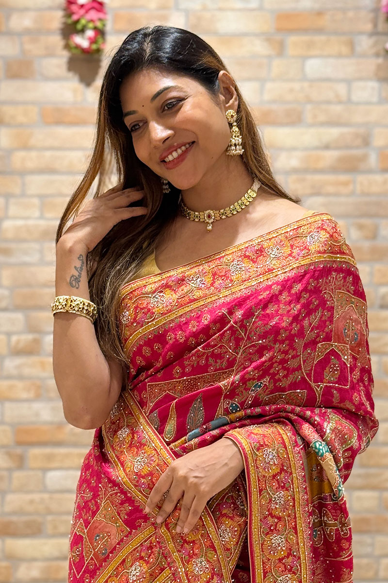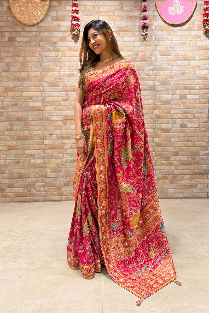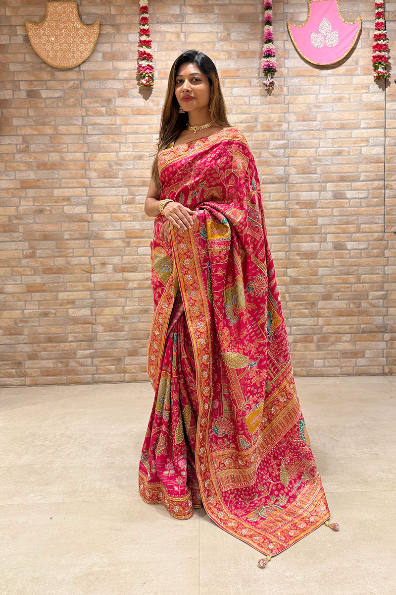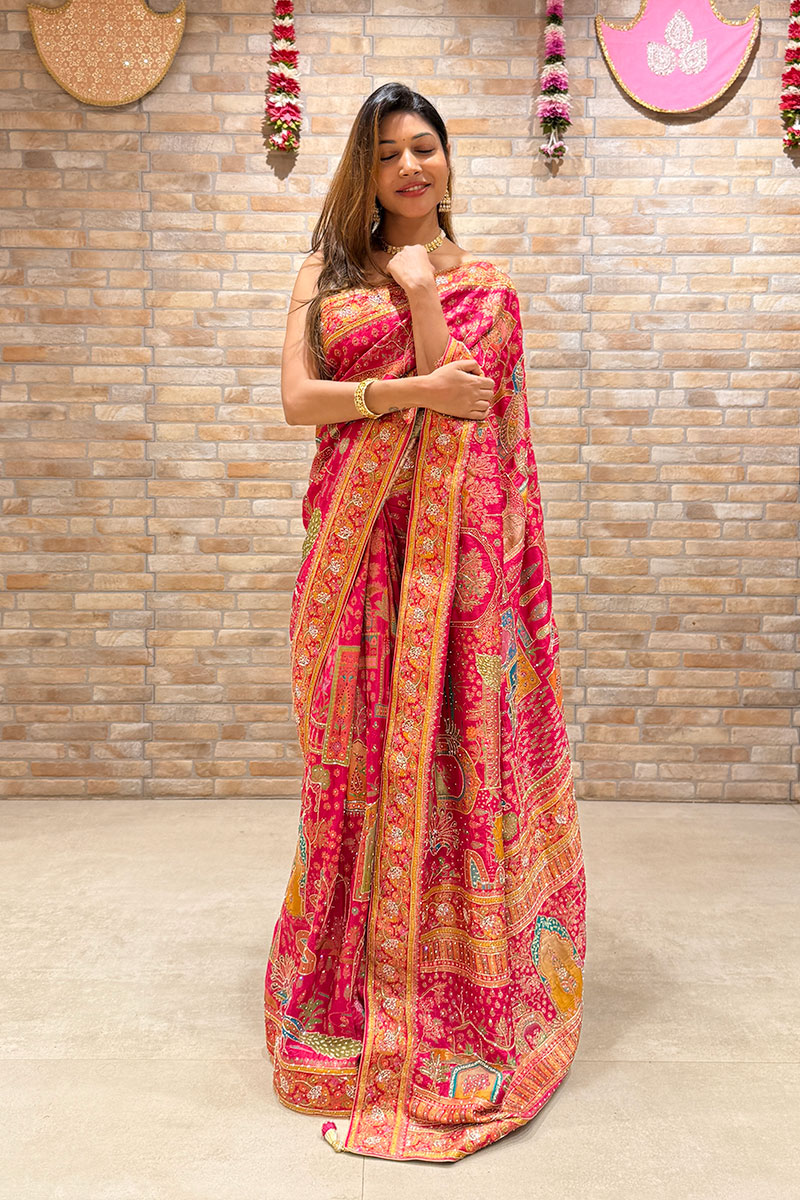 Enhance your fashion style with this exclusive Pink colored designer saree. Order this saree which is made of Silk fabric and is beautifully crafted with Bandhani Printed and Embroidery Work. Pair this saree with ethnic jewellery and a pair of heels to elevate your style. This saree comes with Contrast, Silk fabric Blouse. Note slight color variation may be possible due to the digital photography. Accessories shown in the image is for photography purpose.