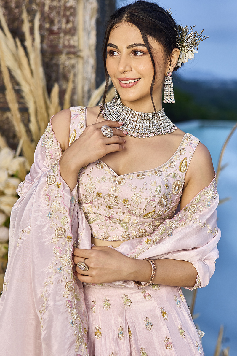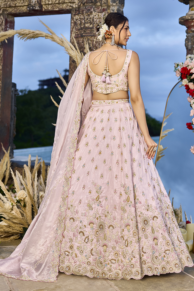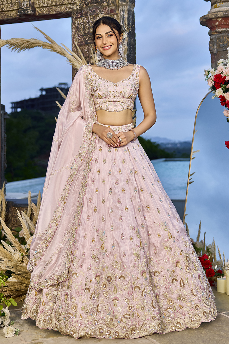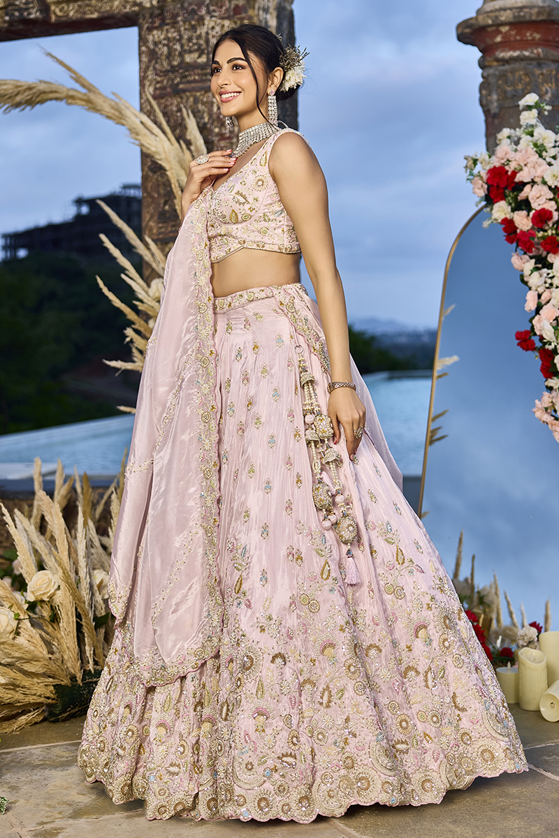 Wear the graceful Pink colored Designer Indo-Western Lehenga Choli. Collection of this lehenga choli crafted from Tissue fabric embellished with Sequin, Embroidery, and Coding Work. Has a Thread Cut Work Border on the Hemline. The lehenga has a double shantoon inner with 2 layers of can can 12 and 18 inches with 2 layers of Buckram 4 and 12 inches. The latkan adds a charm to the lehenga composed of hand-made round-shaped tassel, with ethnic work hanging beads latkan. The flare of the lehenga is 3.8 meters and the length is 42 inches. The waist and the bust of the lehenga and choli are customizable up to 40 and 42 inches. Complete your look with ethnic jewelry and heels. The ensemble includes a matching, Tissue fabric dupatta embellished with heavy coding with an embroidery border work. The length of the dupatta is 2.5 meters and the width is 1 meter. Please note that color variations may occur due to digital photography, and the accessories shown are for illustrative purposes only.
