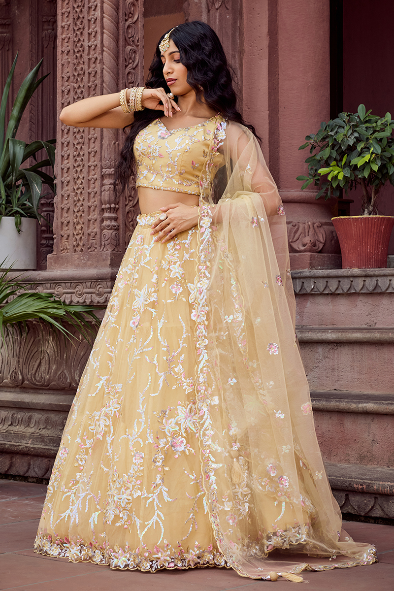 Look for a way to diversify your attire for the day? Then go ahead and wear this alluring Yellow colored Designer Indo-Western Lehenga Choli. Shop online for this lehenga choli crafted from Net fabric embellished with Sequin, Stone, and Coding Work. Has a Thread Cut Work Border on the Hemline. The lehenga has a double shantoon inner with layer of can can 18 inches with 2 layers of Buckram 5 and 10 inches. The flare of the lehenga is 3.5 meters and the length is 42 inches. The waist and the bust of the lehenga and choli are customizable up to 40 and 42 inches. Complete your look with ethnic jewelry and heels. The ensemble includes a matching, Net fabric dupatta embellished with heavy coding with an embroidery border work. The length of the dupatta is 2.5 meters and the width is 1 meter. Please note that color variations may occur due to digital photography, and the accessories shown are for illustrative purposes only.